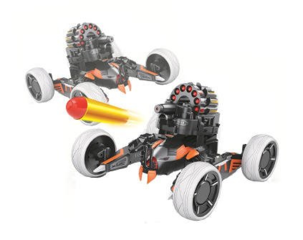 При помощи пульта можно регулировать и высоту пушки с ИК-прицелом для более точного наведения. Боевая машина оснащена пусковой установкой, бьющей стрелами по врагу. При попадании пораженная часть брони отваливается, после 3 попаданий противник полностью выходит из строя. Светодиодная индикация фар машины подскажет о количестве пропущенных выстрелов, а яркие световые и звуковые эффекты добавят сражению реалистичности. Keye Toys Space Warrior KT703 работает от 5 батареек типа АА, еще 4 понадобятся для пульта ДУ