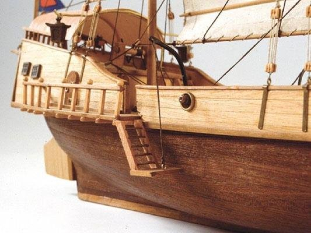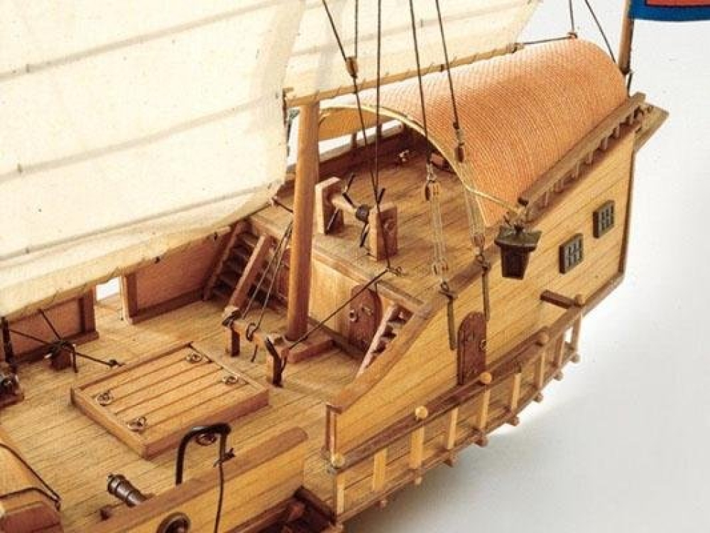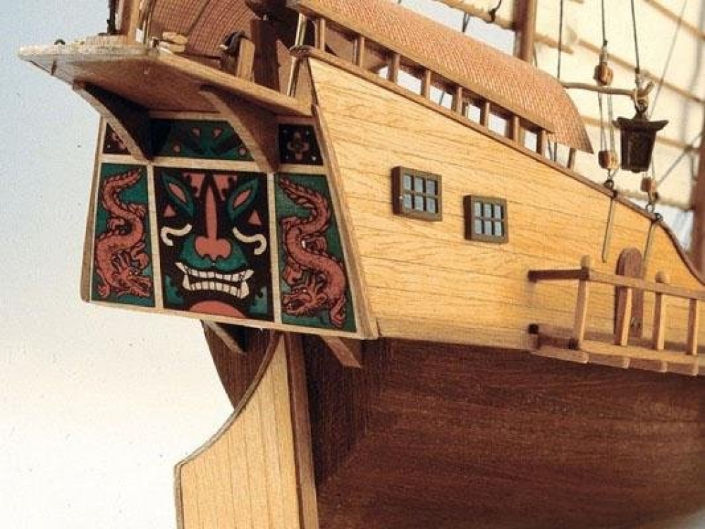 Деревянная модель джонок, которые плавали по рекам и океанам на Дальнем Востоке между Сингапуром и северным Китаем. Появление джонок задокументировано около 600 г. до н.э. Корпус без киля и короткой кормой; его паруса сделаны из плотной ткани, усиленной тростником, что обеспечивает большую устойчивость и движение. Это была одна из самых используемых лодок для пиратов у берегов Юго-Восточной Азии. Мачты из ореха, мелкие деревянные детали из самшита. Литые пушки установлены на лафетах, палуба содержит множество элементов, в т.ч. и шпиль, люки и шлюпку. Якорь, который имеет отличную от европейского конструкцию, установлен в носовой части джонки. Изображения драконов, нити для такелажа двух цветов и диаметров, латунные гвоздики, красивая табличка с названием модели - всё это содержится в наборе.