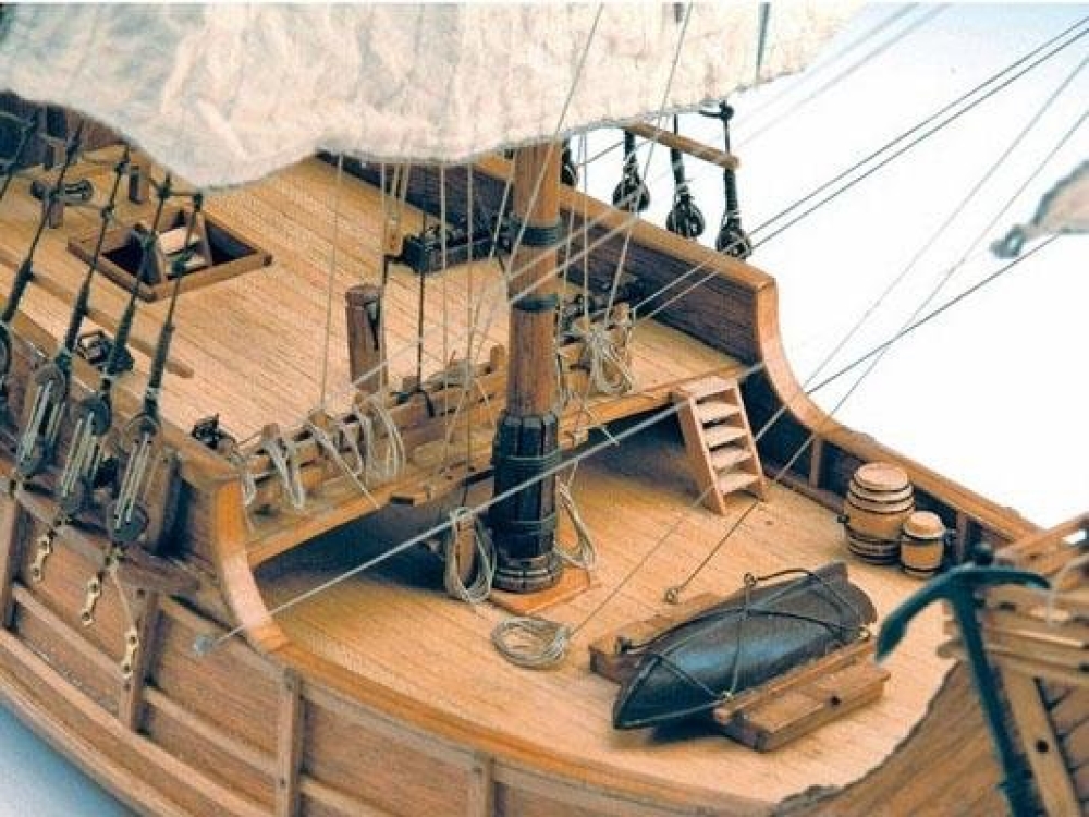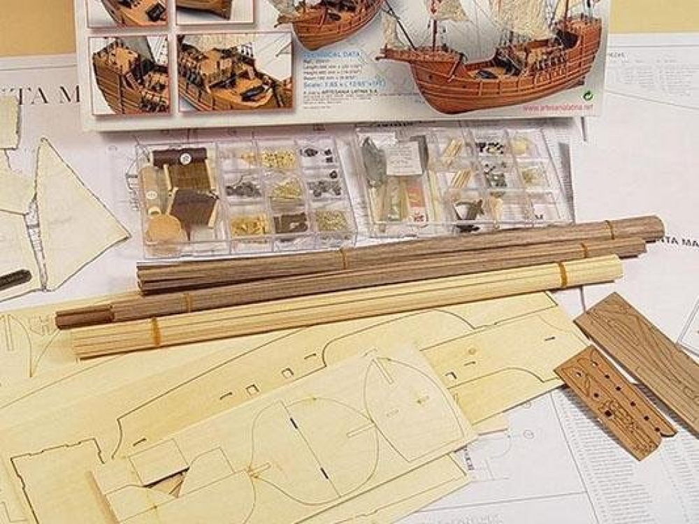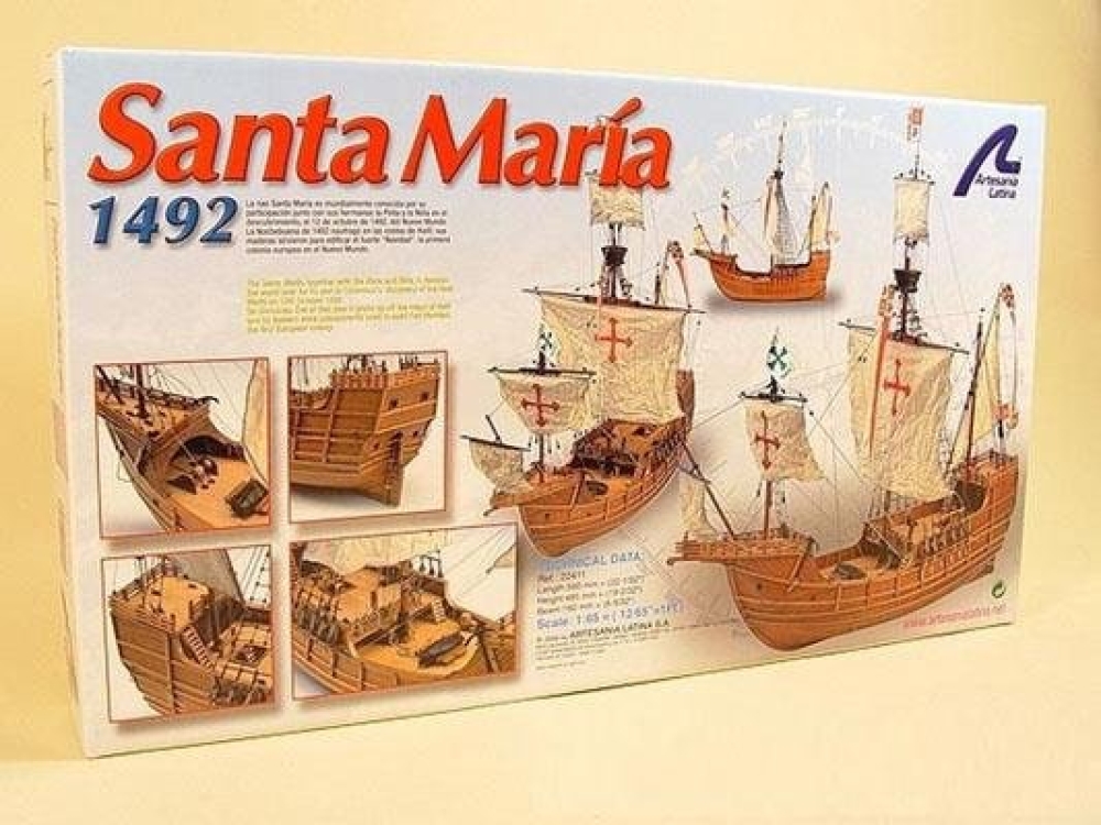 Составные части модели выполнены из разных сортов дерева. Реалистичность придает большое количество деталей - кормовой фонарь, шлюпка, трапы, шпиль и всевозможные трапы. Вооружение состоит из четырех пушек 15-го века и двух фальконетов. В комплект модели каравеллы Санта-Мария входят дерево, латунь, чугун и сшитые вручную паруса, готовые к установке. Для сборки вам будут предоставлены наши полные пошаговые инструкции, сопровождаемые полномасштабными чертежами готовой лодки.