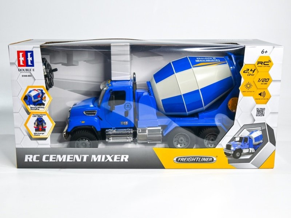 Радиоуправляемый бетоновоз Double Eagle Freightliner 114SD в масштабе 1:20. Полный контроль управления позволяет игрушке двигаться вперед/назад, влево/вправо, совершать повороты и остановки. Ребёнок сможет управлять не только колёсами и направлением движения, но и барабаном, способным вращаться на 360°.