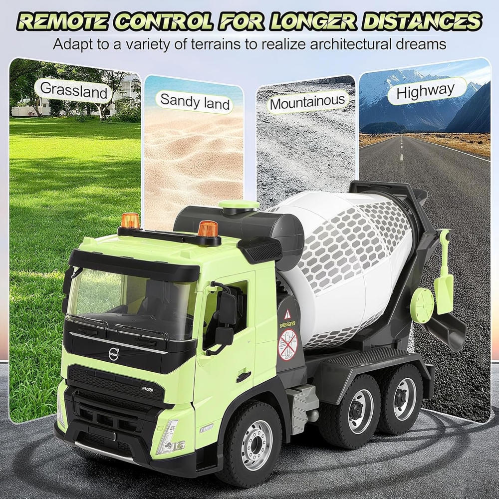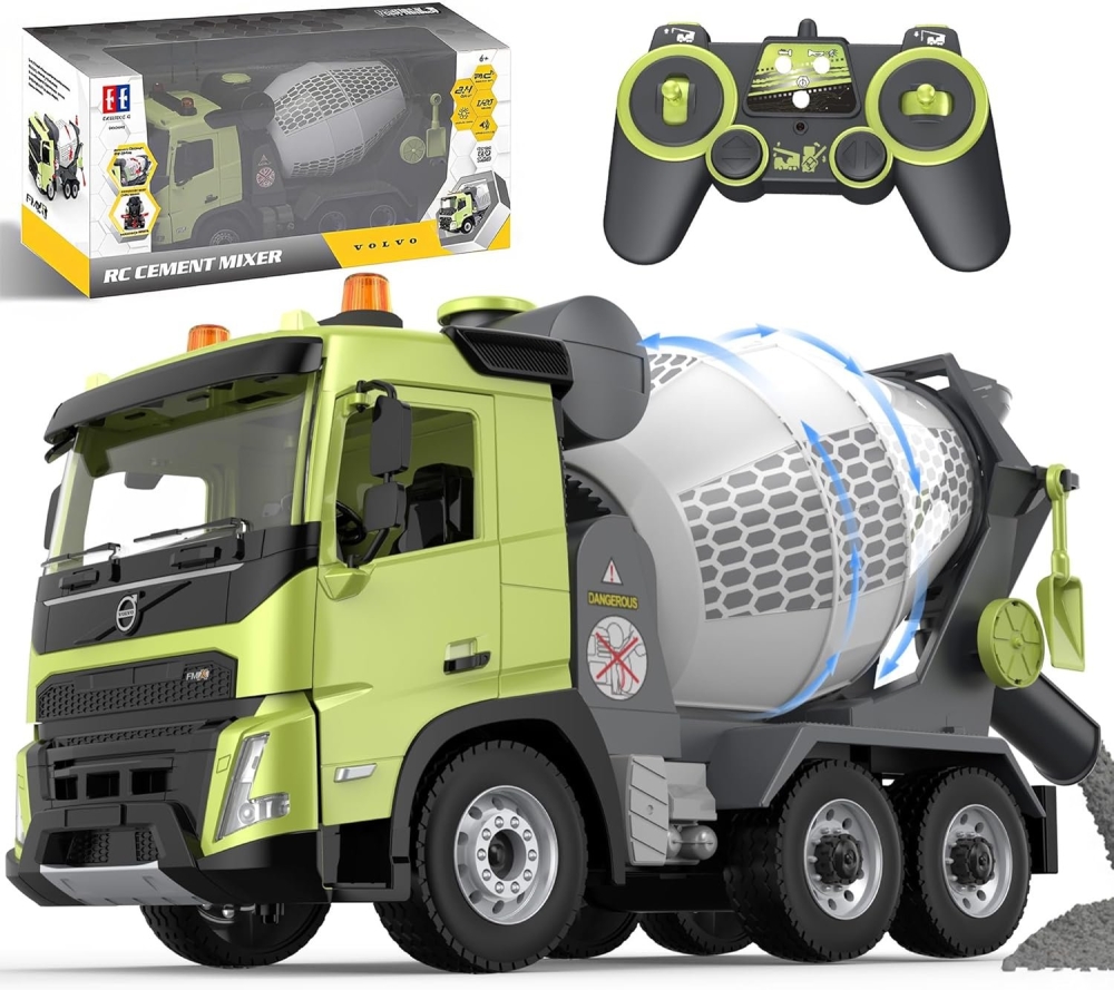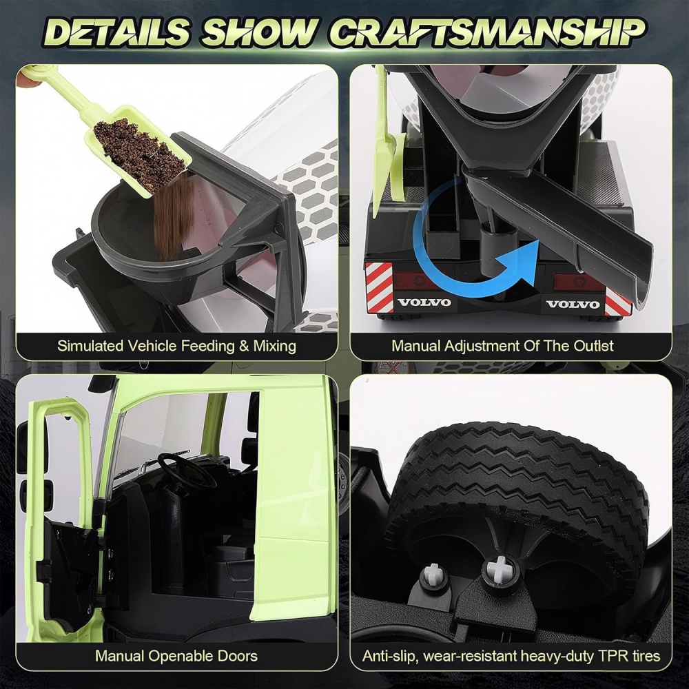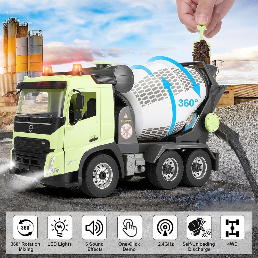 Радиоуправляемый бетоновоз Volvo FMX от Double Eagle в масштабе 1:20. Высокая степень детализации. Оснащён механизмом вращения. Смеситель вращается и выгружается дистанционно с помощью пульта дистанционного управления. Бетоновоз обладает светодиодной подсветкой и рабочими звуками. Эта инженерно-строительная игрушка не только помогает детям получить больше знаний о транспортных средствах, но и позволяет им потенциально заинтересоваться профессиями, связанными с ними.