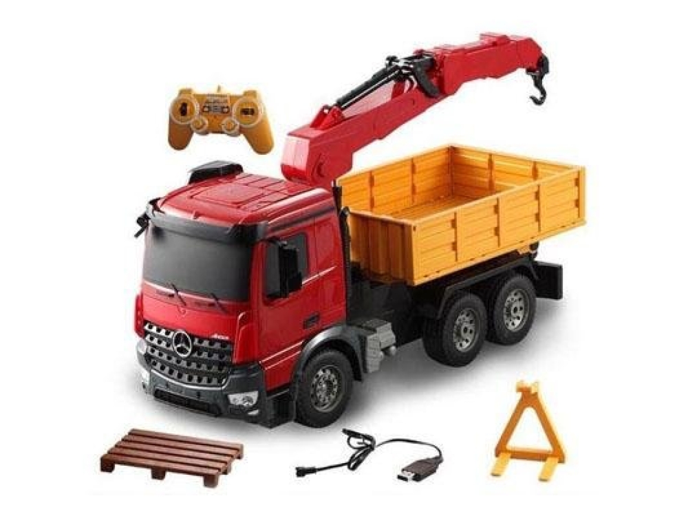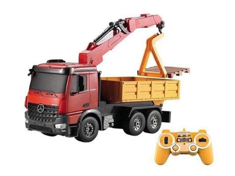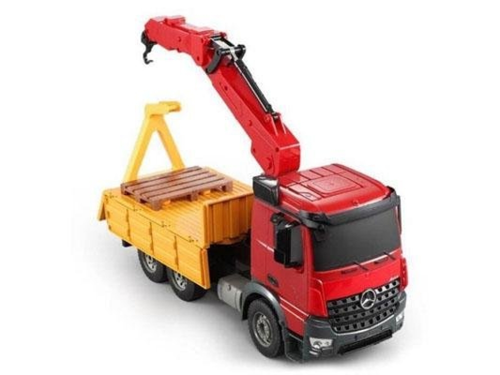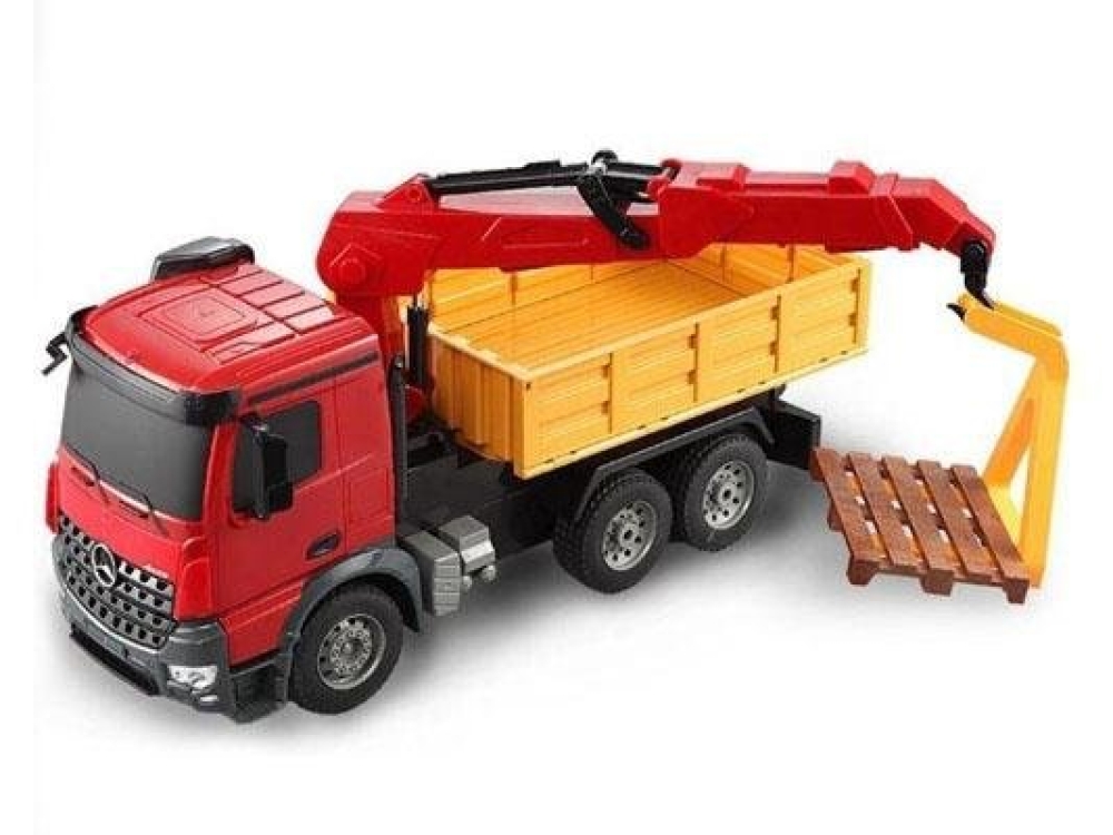 Большой оригинальный грузовик-погрузчик с манипулятором. Грузовик ездит во всех направлениях с помощью дистанционного управления, также с помощью пульта вы можете управлять манипулятором для погрузки/разгрузки. Модель имеет резиновые колеса и светящиеся фары. В комплекте идет паллет для размещения на нем грузов. Игра сопровождается звуковыми эффектами - звук двигателя, движение задним ходом, остановка грузовика.