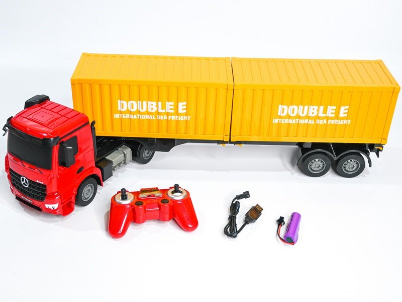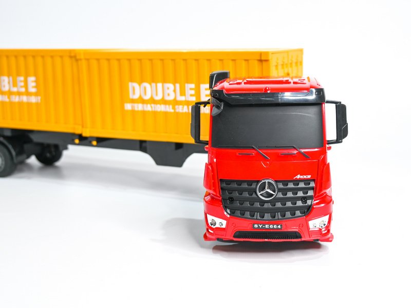 Радиоуправляемый контейнеровоз Mercedes-Benz Arocs от Double Eagle в масштабе 1:26. Прицеп можно пристегивать и отстегивать, в нем можно открывать задние двери и перевозить грузы. Световые и звуковые эффекты.