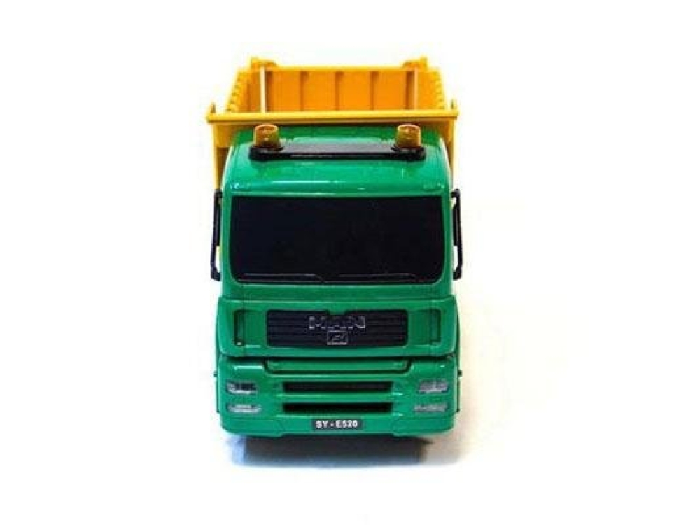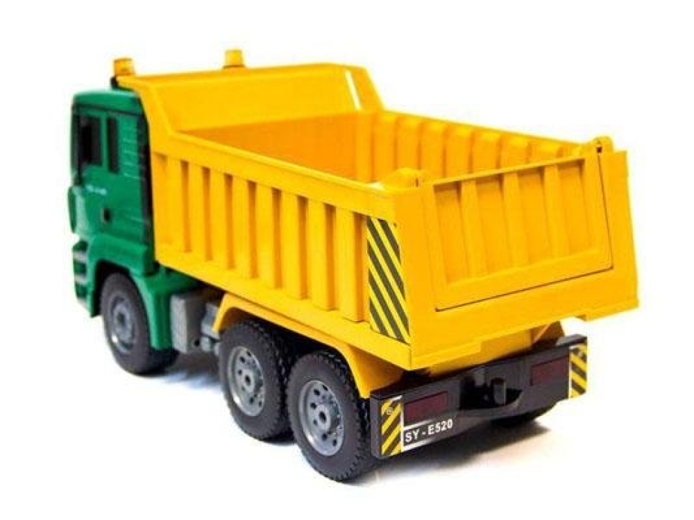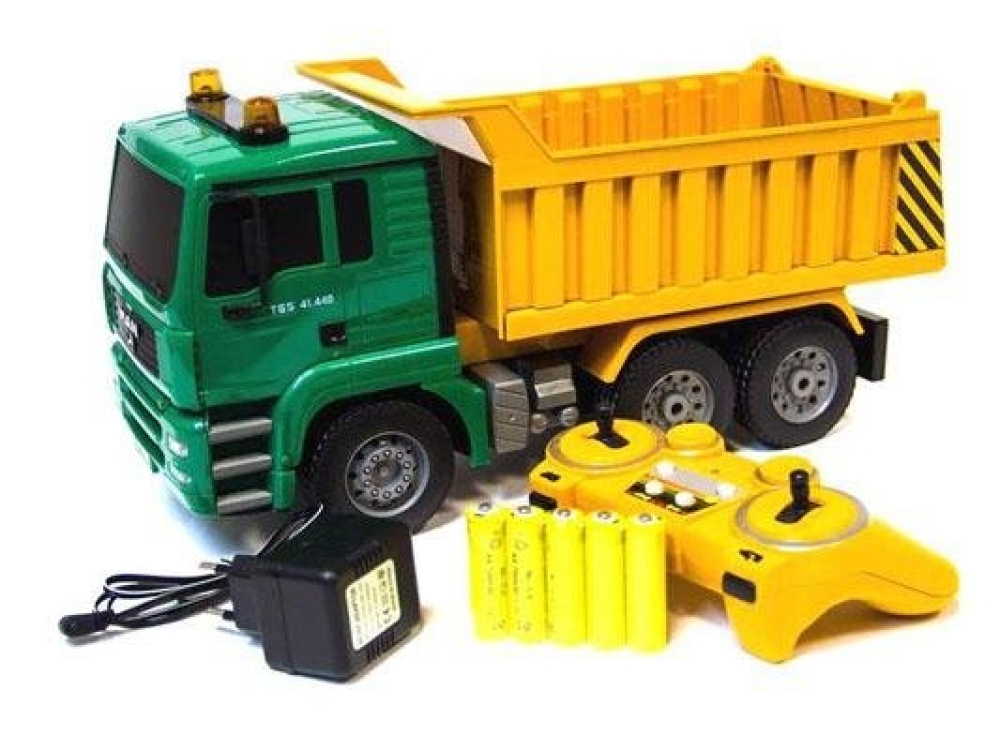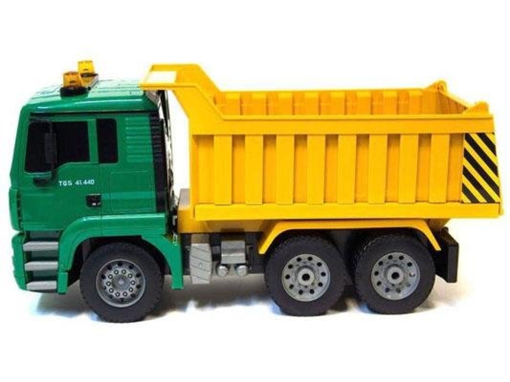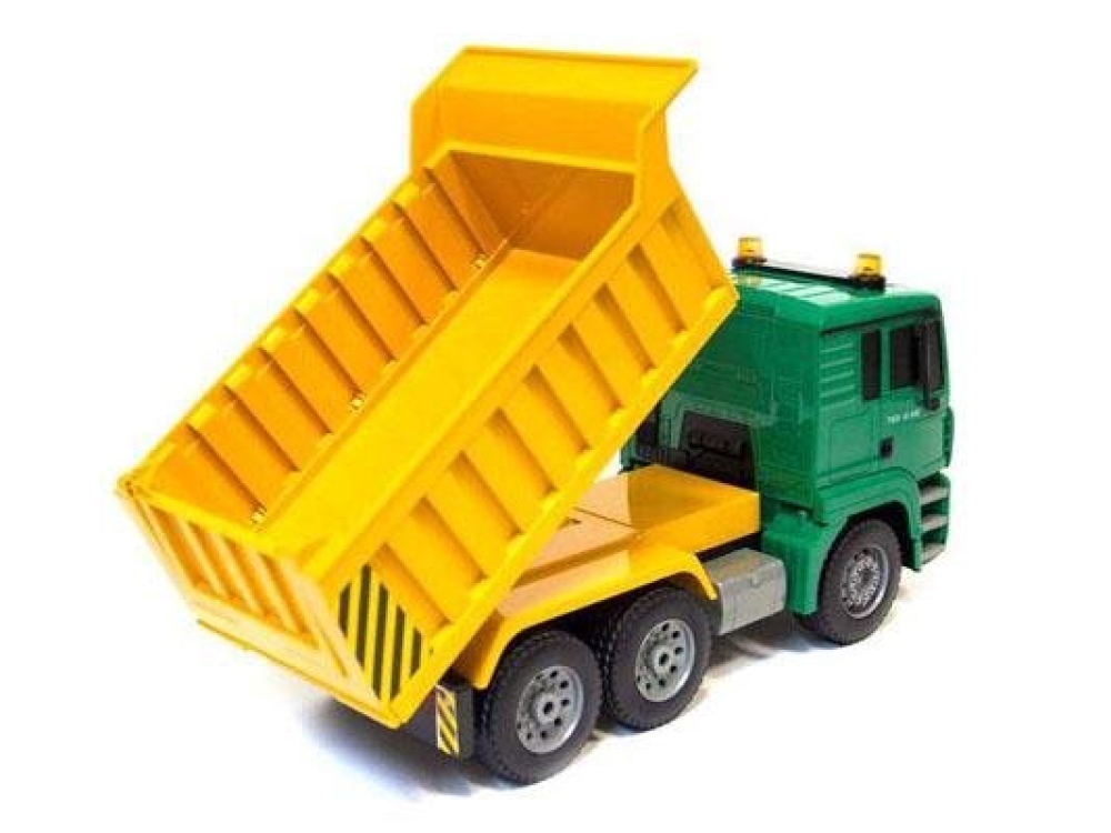 Модель самосвала на пульте управления ездит вперед/назад и поворачивает колеса. Кузов грузовика поднимается высыпая набранный груз, например, в виде песка или камней. При этом фары машины светятся и звуковые эффекты имитируют работу мотора. Колеса автомобиля резиновые, а не пластиковые, что гарантирует отличное сцепление с дорогой.