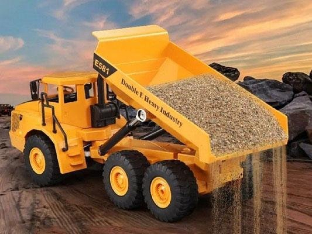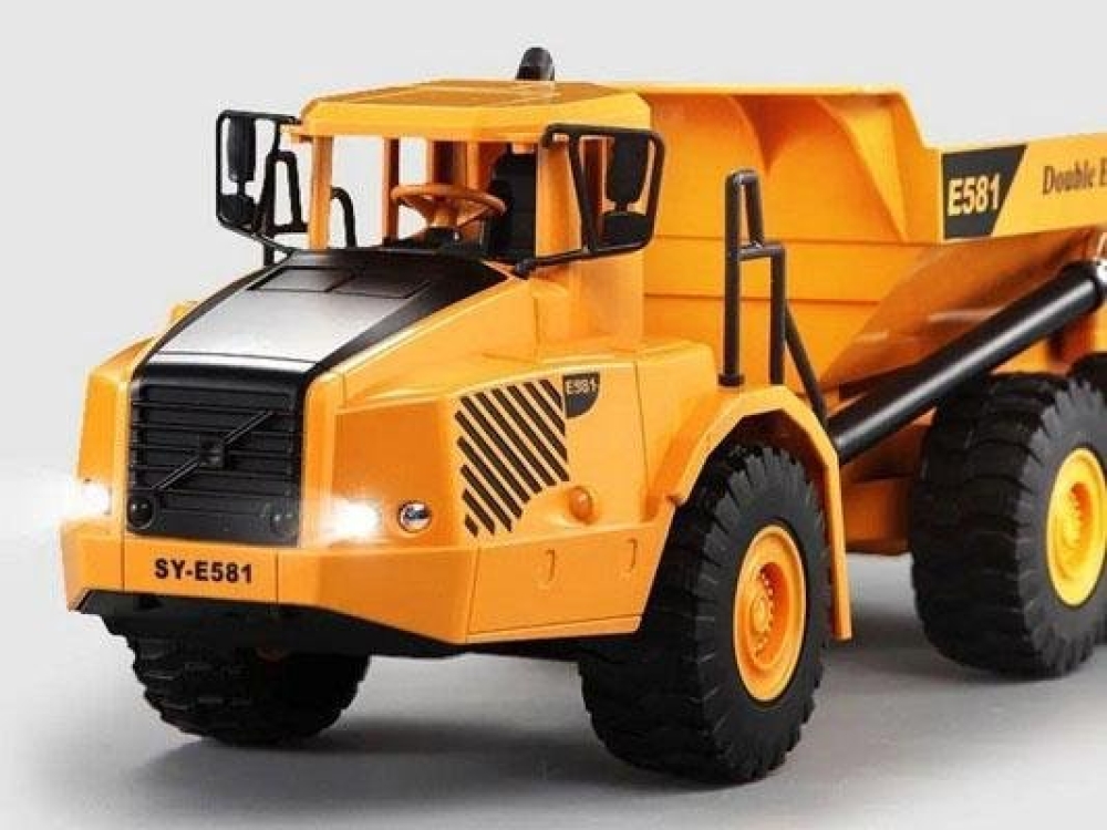 Такой самосвал используется на песчаных карьерах и алмазных трубках. В его кузов поместится большой объем грунта, который можно надежно перевезти и высыпать в необходимом месте. Для перевозки в темное время суток на модель установлены светодиодные фары, а во время движения самосвал издает звуковые эффекты, например, работу двигателя. Задняя часть машины с кузовом, крепится к передней особым шарниром, поэтому самосвал невероятно маневренный для своего типа. Так что вы без труда объедете какие либо препятствия - камни, ветки и т.п. Колеса имеют резиновые покрышки, которые хорошо амортизируют неровности дорожного полотна.