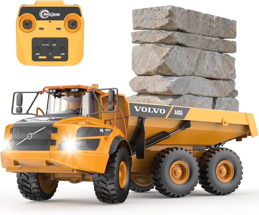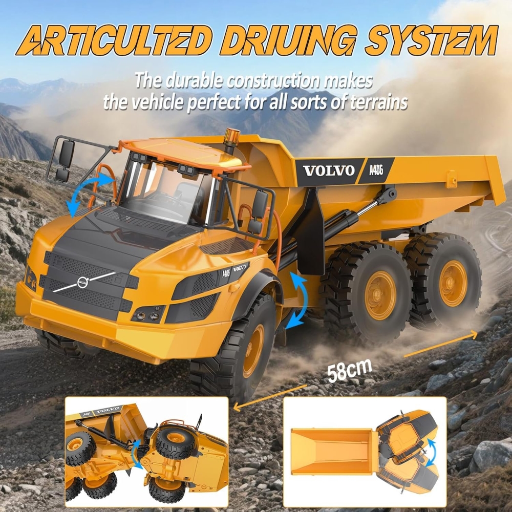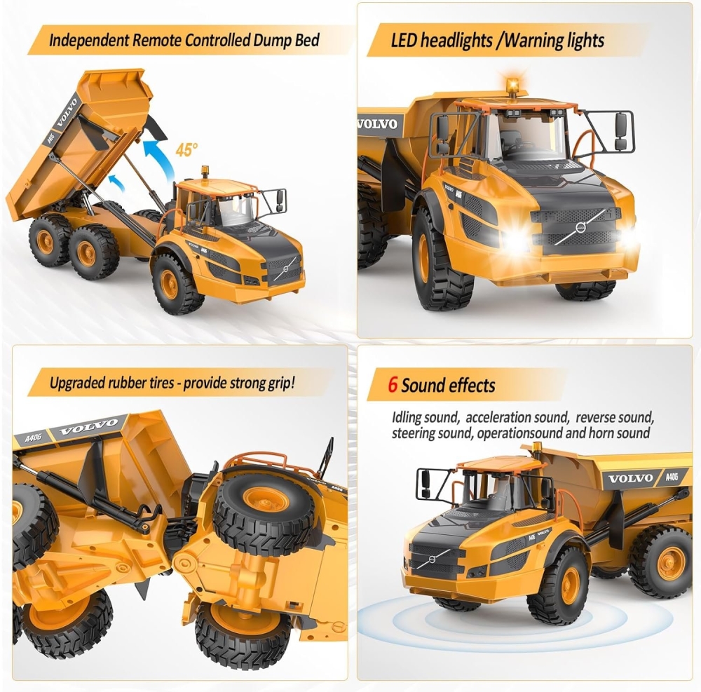 Высокая степень детализации. Оснащён подъёмным кузовом. Полная пропорциональная скорость и рулевое управление, вперед/назад, левый/правый поворот. Оснащен светодиодными передними фарами и сигнальными огнями. Разнообразные звуковые сигналы: звук холостого хода, звук ускорения, звук назад, звук рулевого управления, рабочий звук. Отличная проходимость при помощи мощных колес и полного привода. Неограниченное количество часов увлекательной и интересной игры подарит эта игрушка вашему ребёнку.