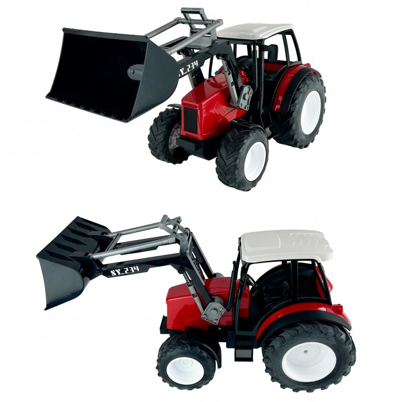 Ручной сельскохозяйственный трактор от Double Eagle в масштабе 1:16. Оснащён подвижным погрузчиком с ковшом и сцепным устройством. Колеса вращаются, трактор можно катать.