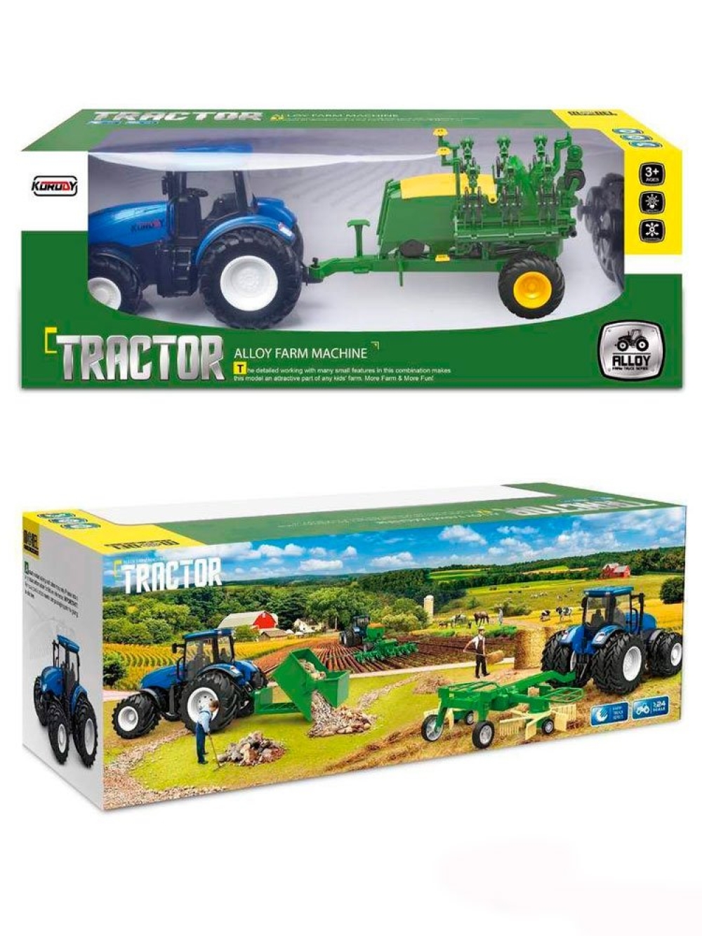 Трактор имеет яркий и красивый внешний вид, а резиновые широкие колеса прекрасно ездят по любой поверхности. Трактор двигается вперед, назад, способен повернуть налево и направо, включить/выключить свет, а также включается демонстрационный режим. К тракторам Korody легко прицепляется навесное оборудование, чтобы показать детям, как возделываются поля и выращиваются сельскохозяйственные продукты. Трактор имеет в комплекте зерновая сеялка. Сеялка легко снимается и может перемещаться самостоятельно. Игрушка полностью управляется с пульта дистанционного управления на расстоянии до 45 метров. Все действия сопровождаются звуковыми, а также световыми сигналами.