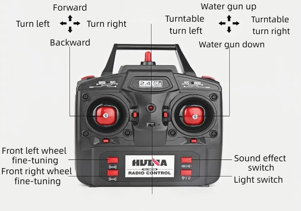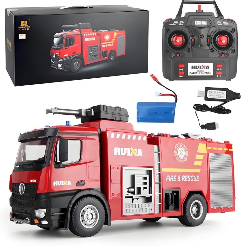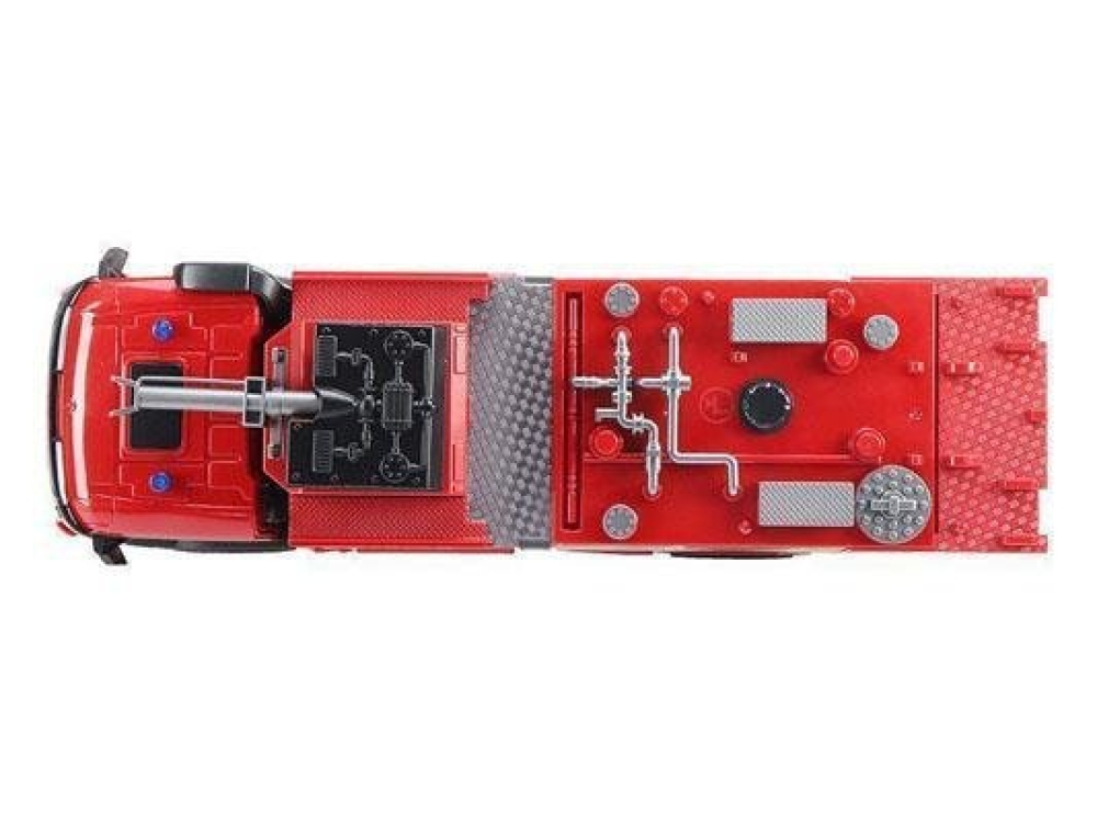 Огромная многофункциональная пожарная машина с 22 каналами управления. Выполнена с высокой детализацией и имеет различные подвижные элементы. Например, на крыше установлено устройство пожаротушения. В резервуар заливается вода и направляя шланг на очаг возгорания вы сможете целенаправленно залить его водой. Во время езды передние и задние фары светятся