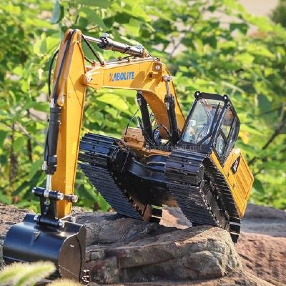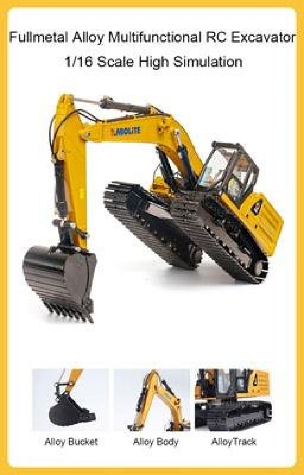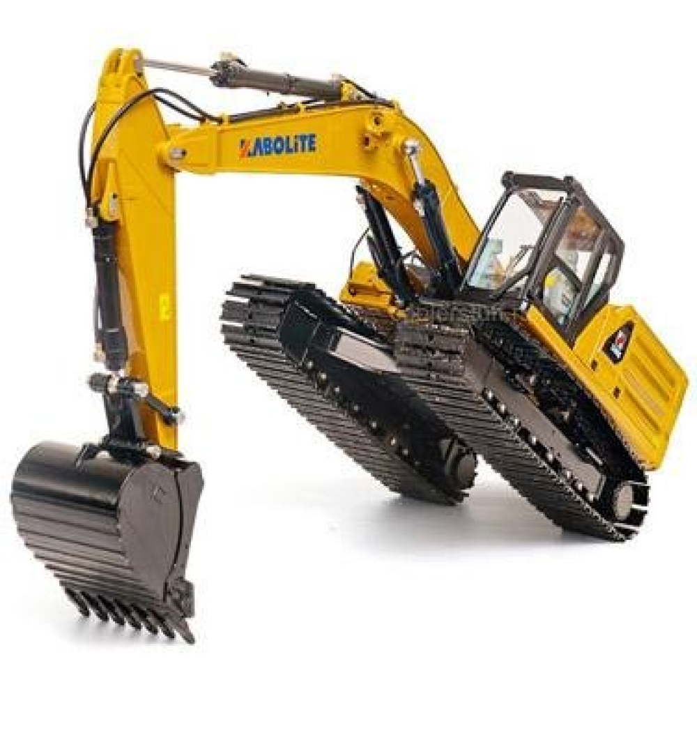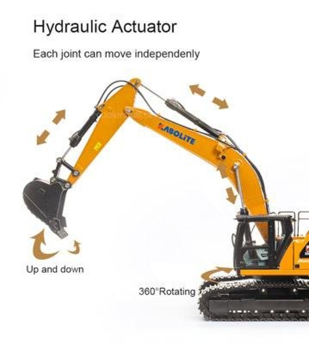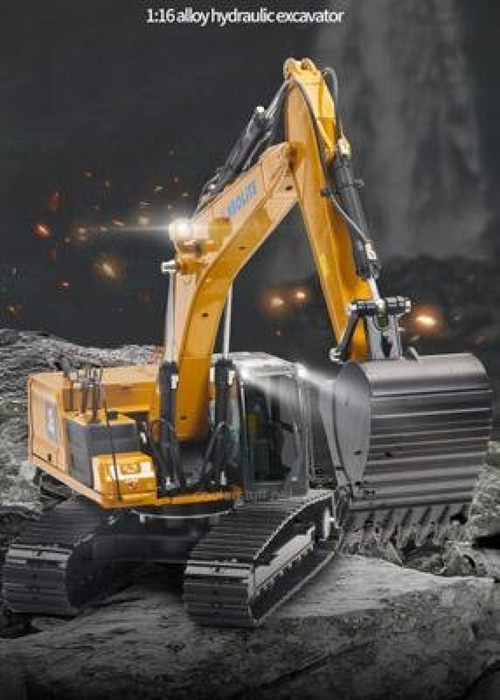 Самая топовая версия экскаватора от компании Huina. Модель полностью повторяет оригинальную технику как внешне, так и по техническому устройству. Имеет большое количество подвижных элементов, стрела с ковшом поворачивается 3-х местах. Экскаватор практически полностью выполнен из алюминия - кузов, ковш, гусеницы. За счет этого модель максимально прочная и долговечная, а мощный коллекторный двигатель делает ее сверхпроходимой по полному бездорожью. Главной особенностью помимо металла является гидравлическая подвижная система - мощная и надежная (перед игрой в резервуар заливается специальное масло).
