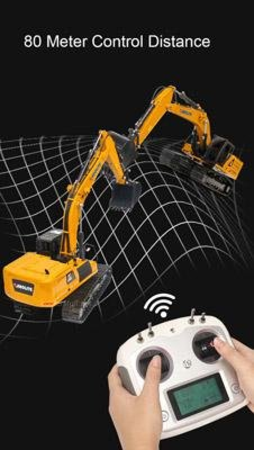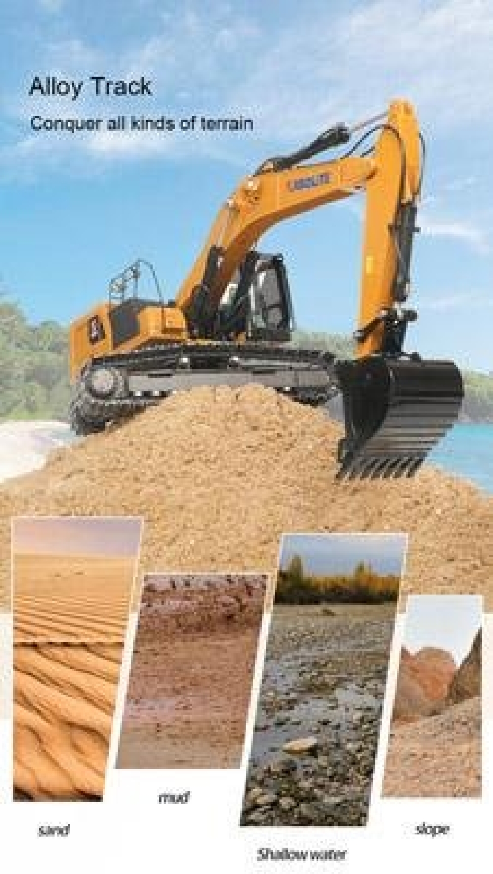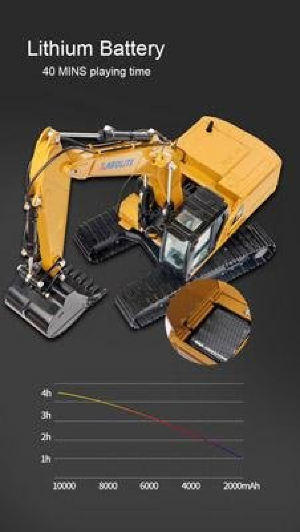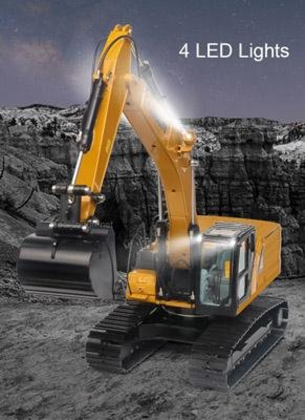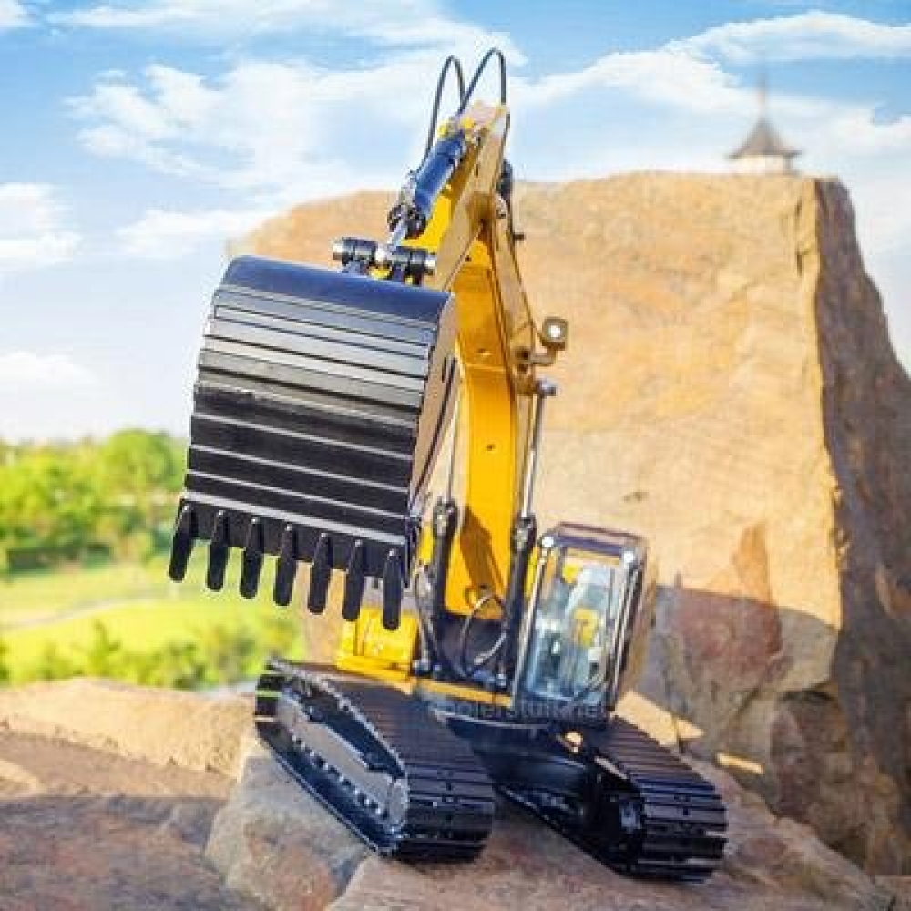 Самая топовая версия экскаватора от компании Huina. Модель полностью повторяет оригинальную технику как внешне, так и по техническому устройству. Имеет большое количество подвижных элементов, стрела с ковшом поворачивается 3-х местах. Экскаватор практически полностью выполнен из алюминия - кузов, ковш, гусеницы. За счет этого модель максимально прочная и долговечная, а мощный коллекторный двигатель делает ее сверхпроходимой по полному бездорожью. Главной особенностью помимо металла является гидравлическая подвижная система - мощная и надежная (перед игрой в резервуар заливается специальное масло).