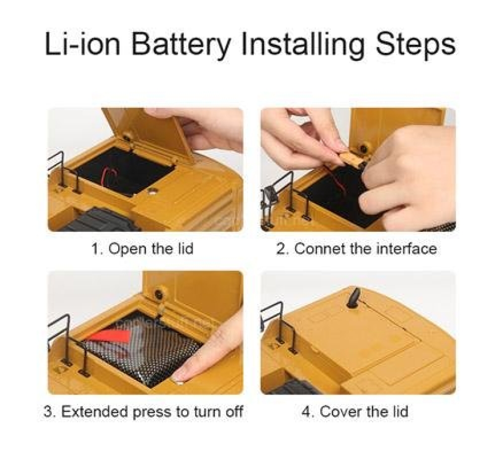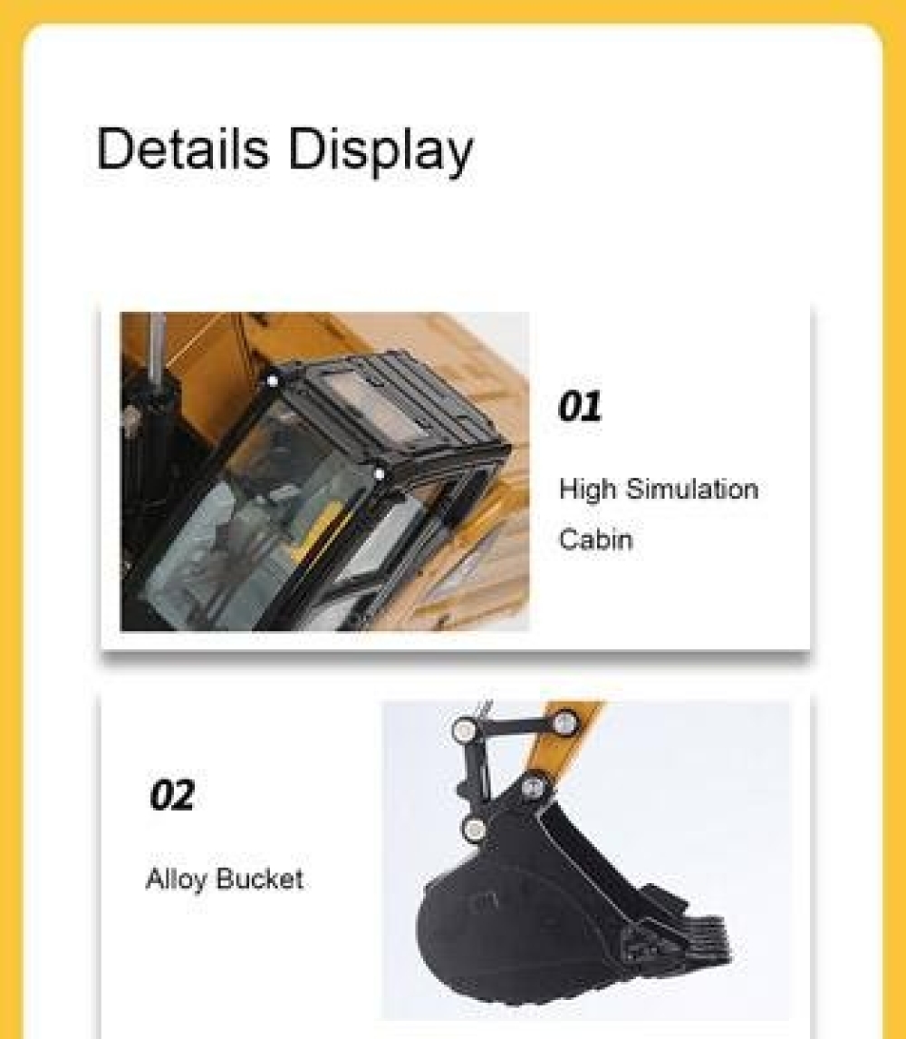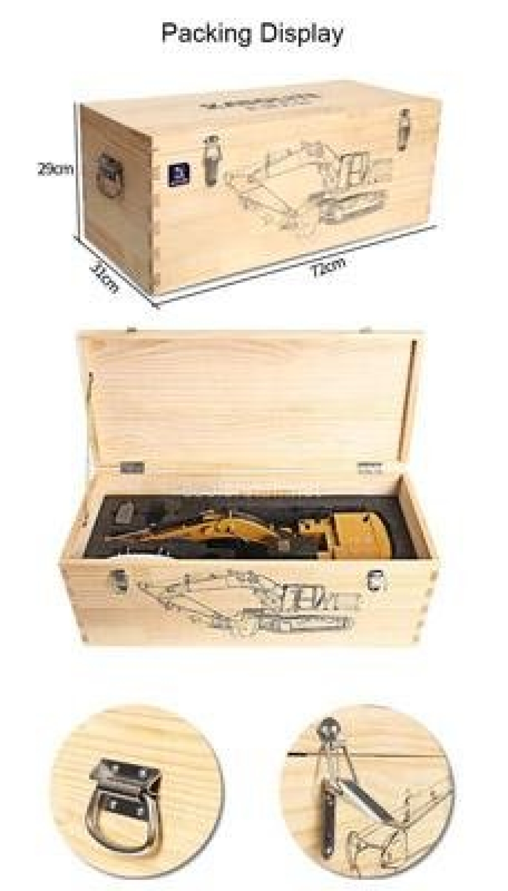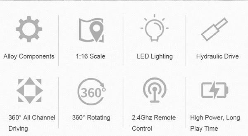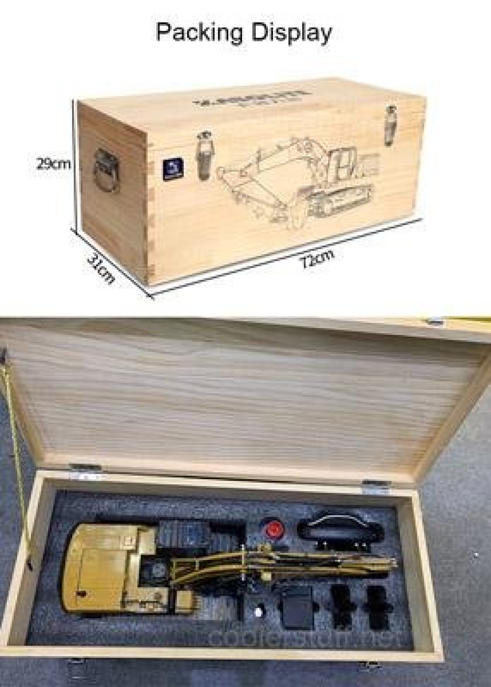 Самая топовая версия экскаватора от компании Huina. Модель полностью повторяет оригинальную технику как внешне, так и по техническому устройству. Имеет большое количество подвижных элементов, стрела с ковшом поворачивается 3-х местах. Экскаватор практически полностью выполнен из алюминия - кузов, ковш, гусеницы. За счет этого модель максимально прочная и долговечная, а мощный коллекторный двигатель делает ее сверхпроходимой по полному бездорожью. Главной особенностью помимо металла является гидравлическая подвижная система - мощная и надежная (перед игрой в резервуар заливается специальное масло).