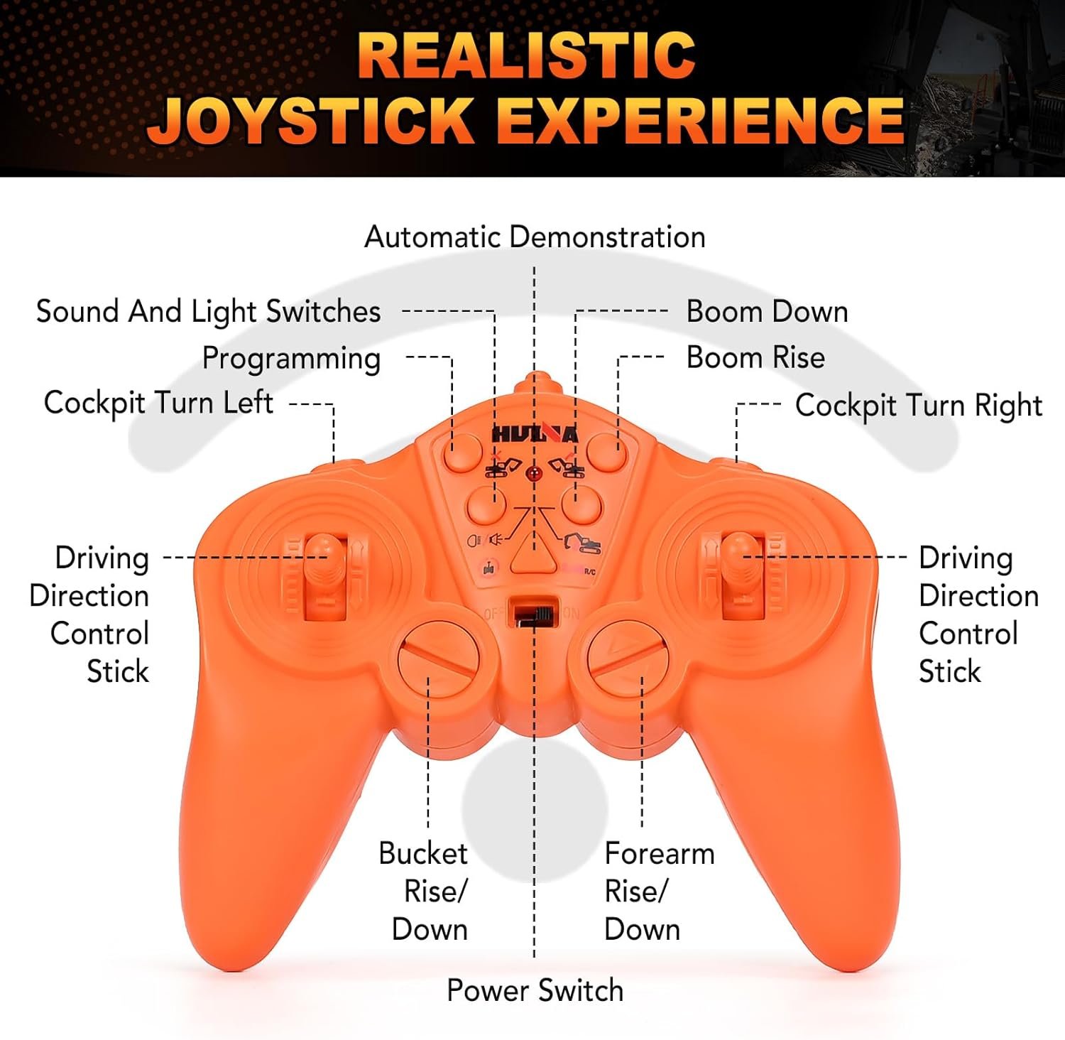 Большой экскаватор на пульте с дистанционным управлением. Многоканальная аппаратура управления идет в комплекте и позволяет управлять стрелой экскаватора практически на профессиональном уровне. База осталась прежней - полностью подвижный экскаватор с поворотной кабиной и сгибающейся стрелой 3-х местах. Игрушка имеет усиленные гусеницы для полного бездорожья. Играть можно на улице в сухую погоду. Вы запросто сможете выкопать яму, разбить сухой грунт и перетащить ветки и камни. Будет отличным дополнением, если у вас уже есть самосвал с кузовом.