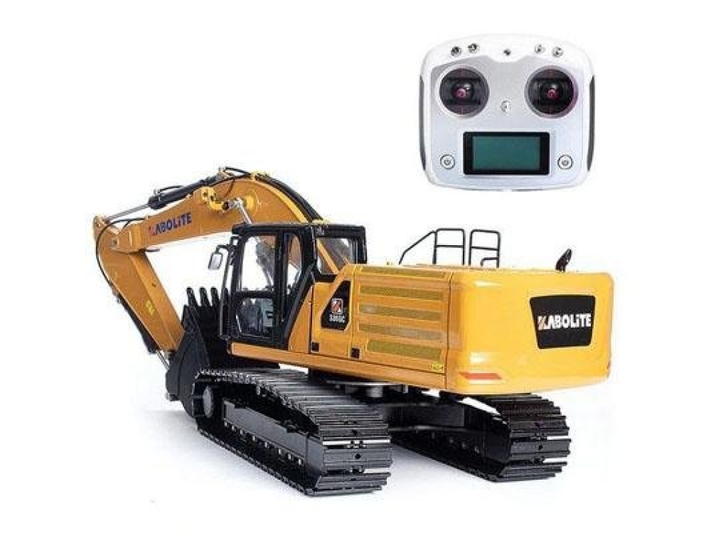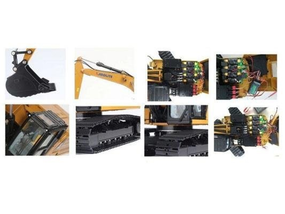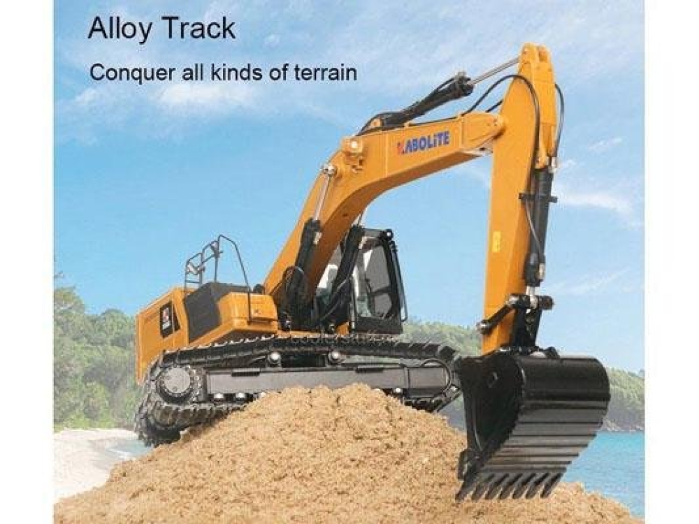 Большой и мощный металлический экскаватор на радиоуправлении с гидравлической системой управления стрелой. Это практически уменьшенная копия настоящего экскаватора. Вес модели 9 кг, она способна выкопать глубокую яму в рыхлом и не только грунте, переместить щебень и небольшие палки. Для работы потребуется гидравлическое масло. На стреле и кабине установлены яркие светодиодные огни для работы в ночное время суток. Управление максимально точное и детализированное благодаря 22-х канальному управлению. Игра будет сопровождаться звуковыми эффектами - звук мотора, движение гусениц.