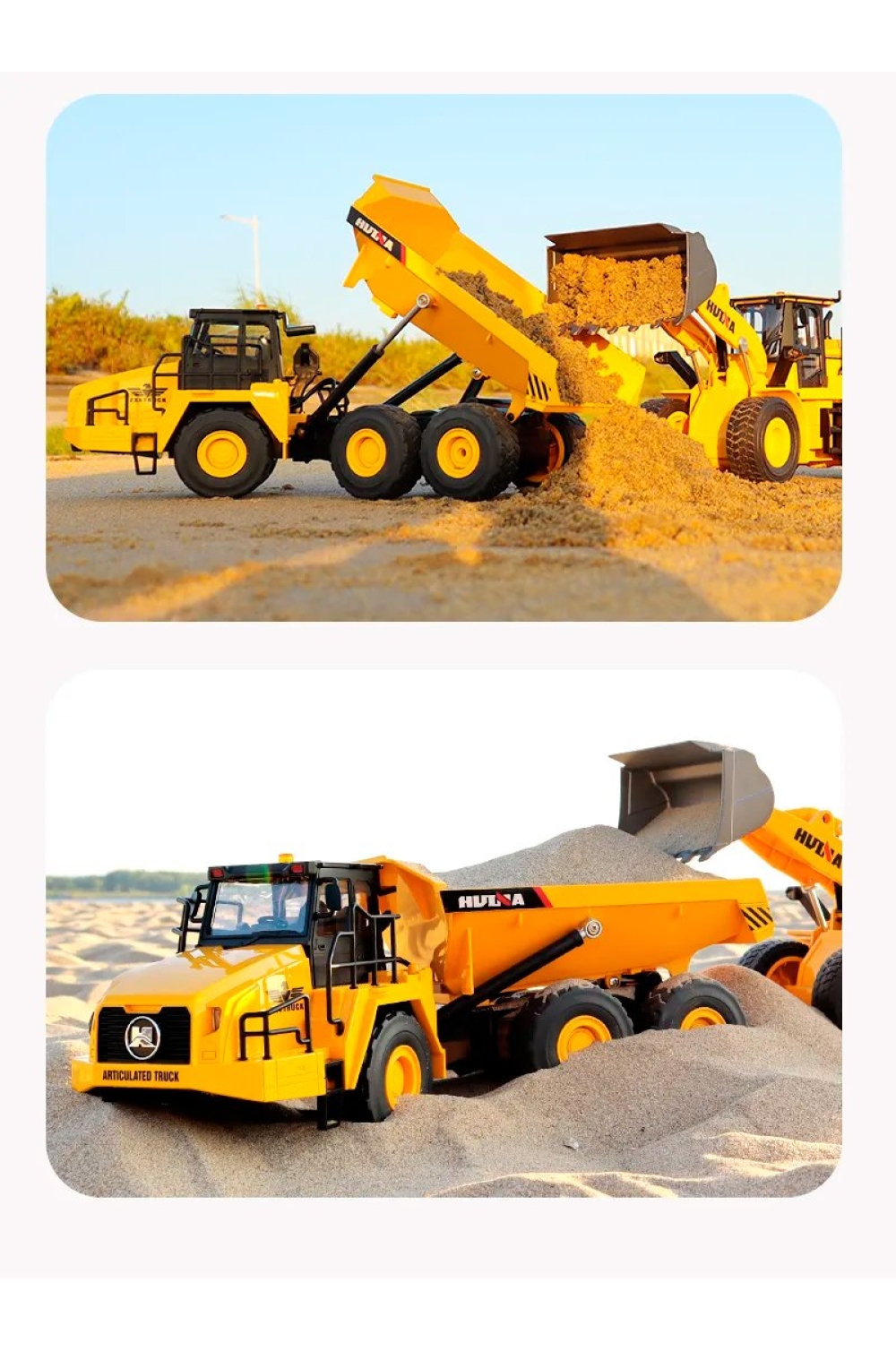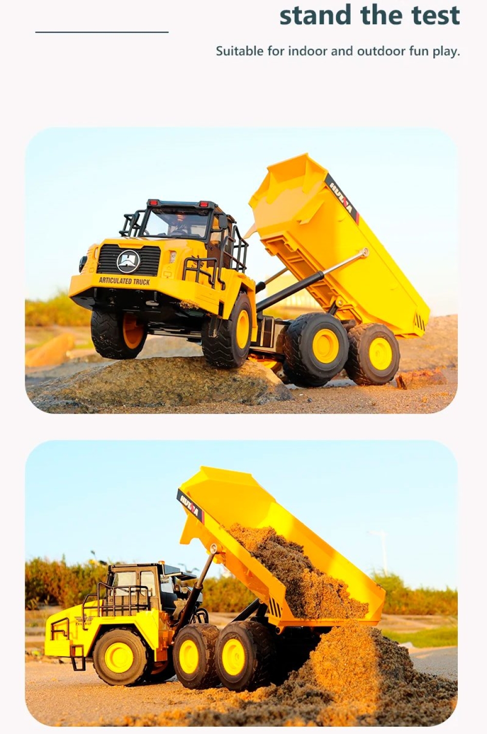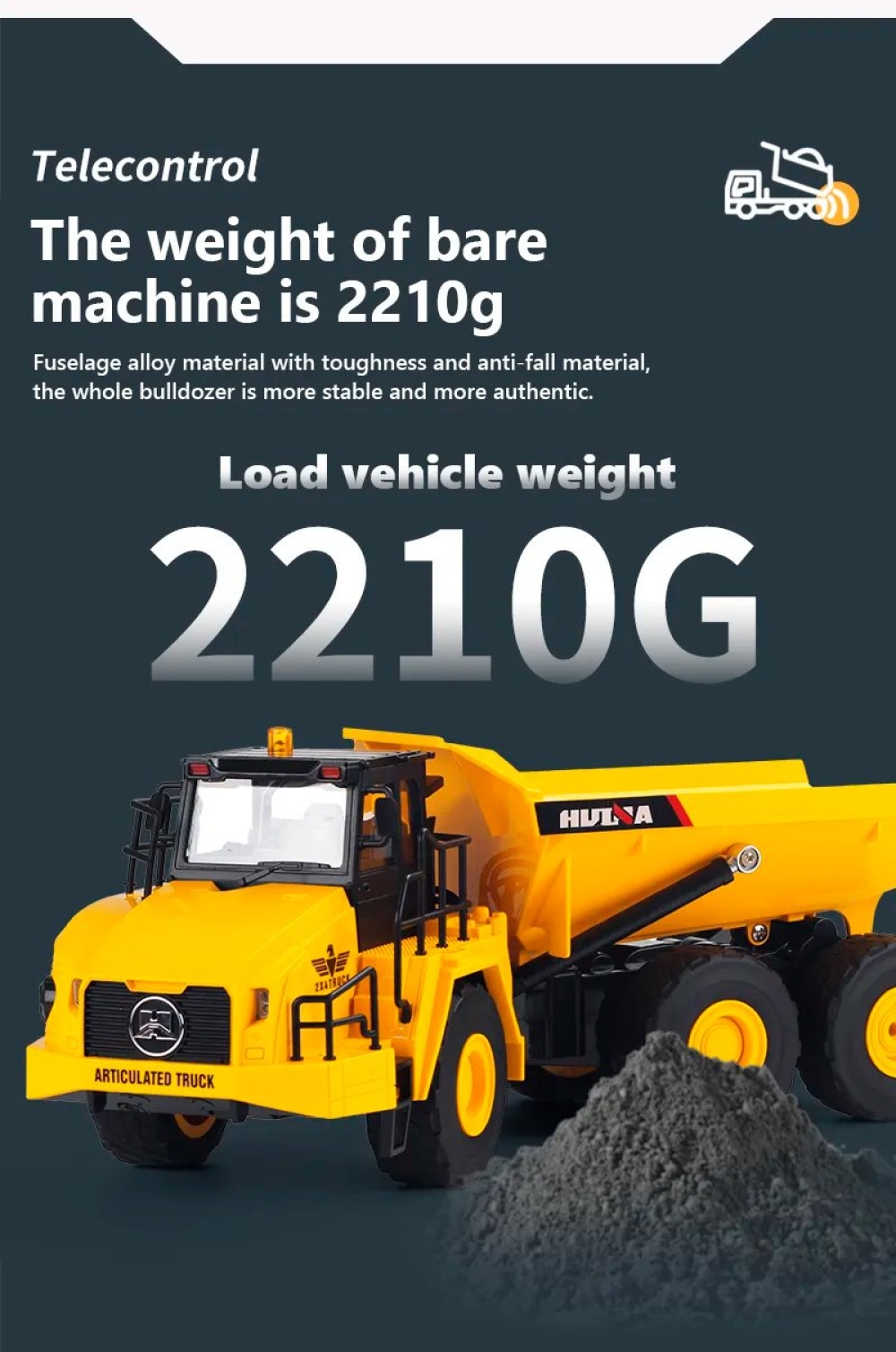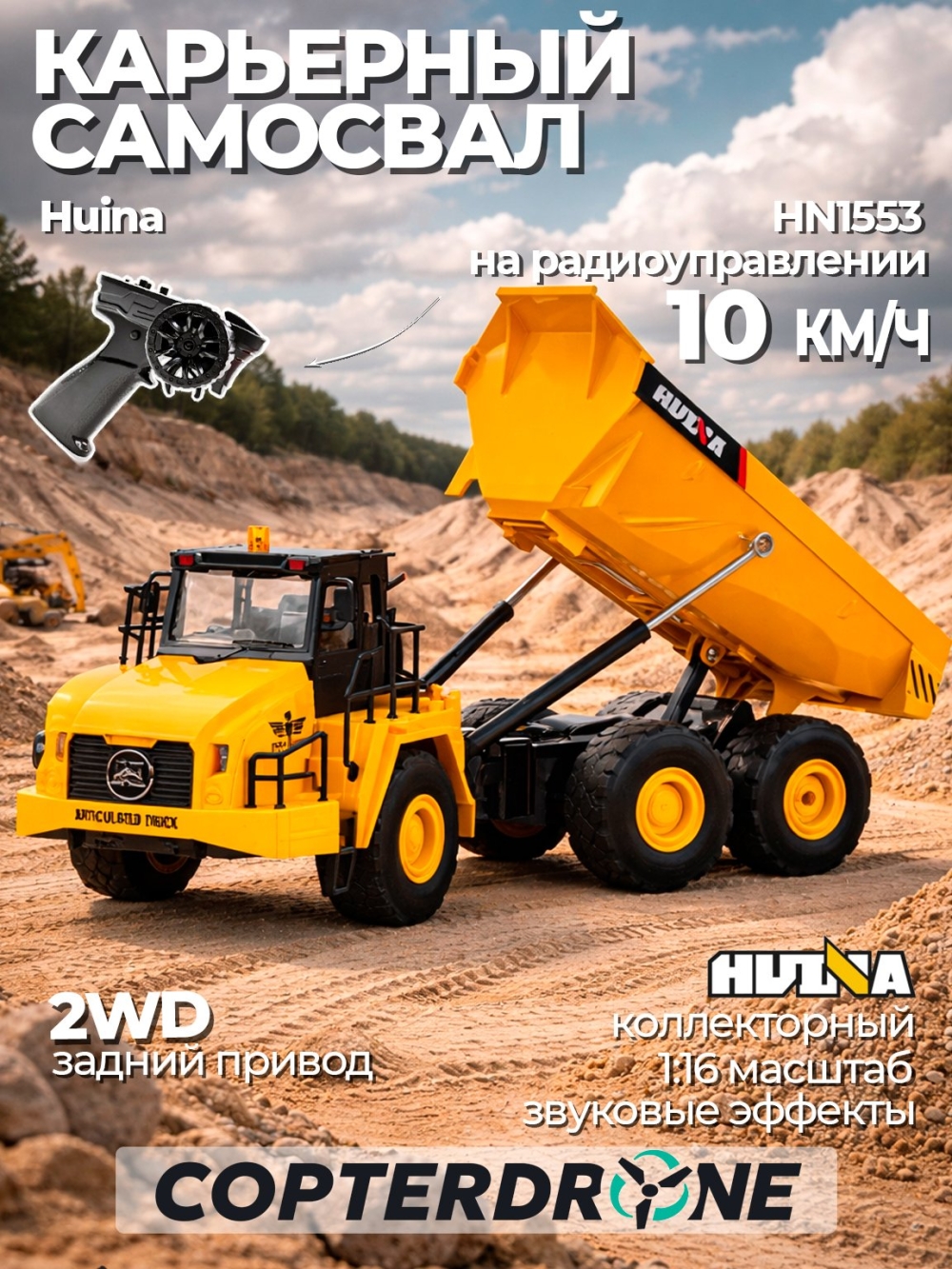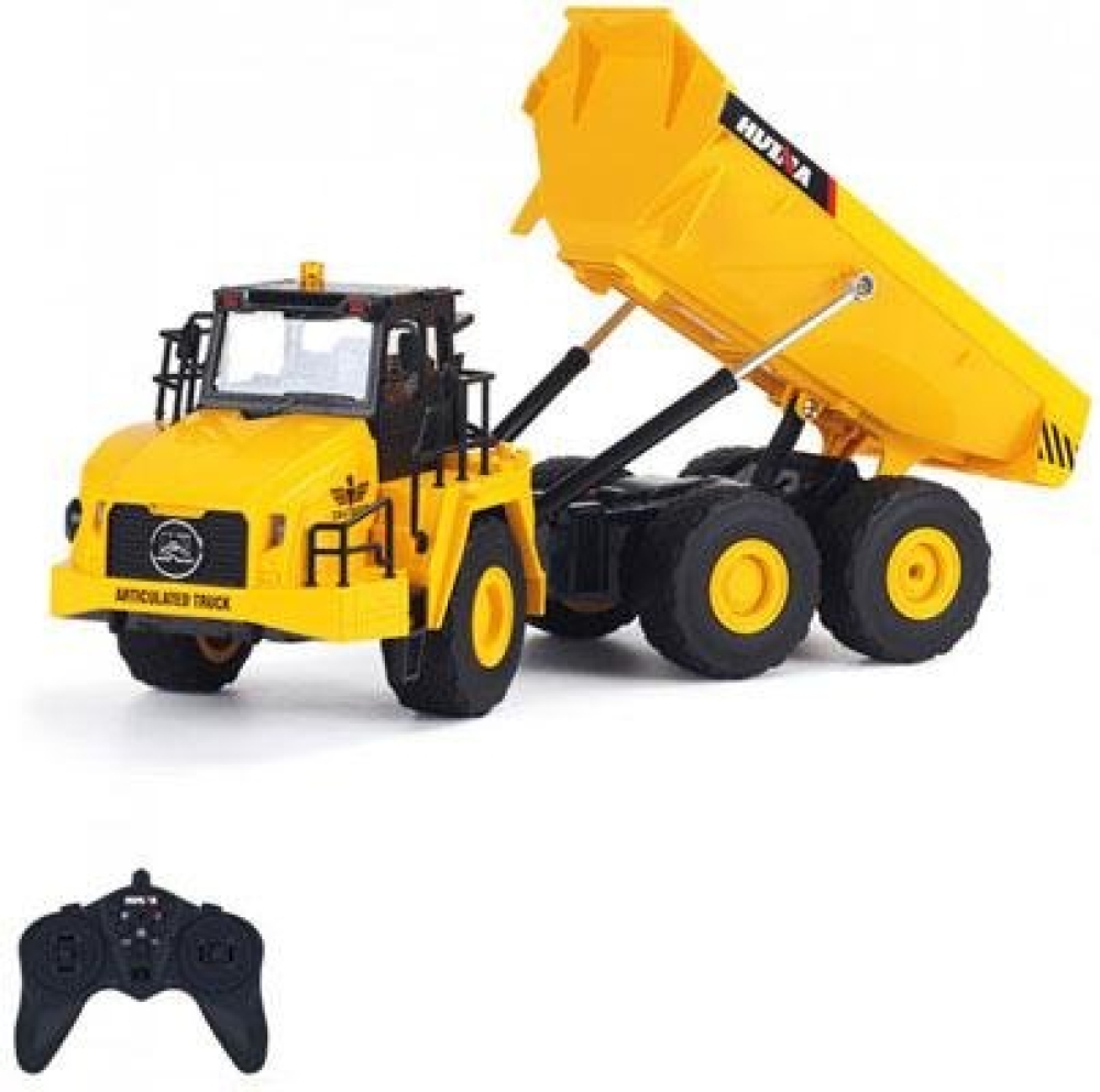 Модель самосвала на радиоуправлении с кузовом, который можно поднимать дистанционно с пульта для выгрузки сыпучих материалов. Машинка имеет резиновые покрышки колес и подходит для игры как дома, так и на улице. Кабина оснащается прозрачными стеклами, поэтому можно заглянуть внутрь и рассмотреть водительское место, которое выполнено с высокой детализацией. Игра сопровождается световыми и звуковыми эффектами. Машинка является копией реально существующих карьерных самосвалов. Модель выполнена из пластика и металла. Управлять игрушкой можно на расстоянии до 50 метров.