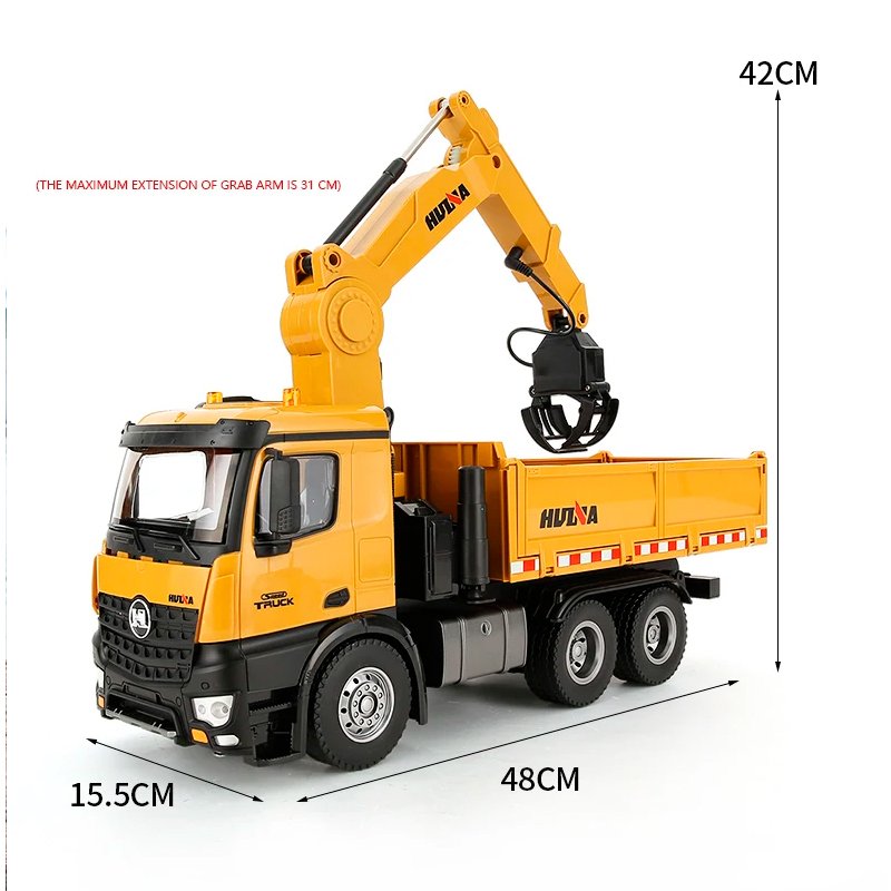 Большой грузовик самосвал с погрузочной стрелой. Управление полностью дистанционное - 8 каналов. Загружайте кузов на расстоянии до 100 метров! Фары машины светятся при движении. Выполнена из пластика и металла.