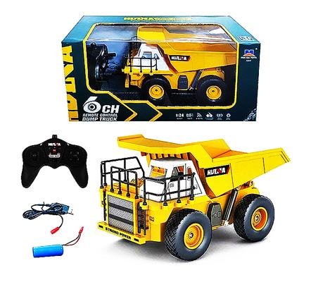 Карьерный самосвал на радиоуправлении, желтого цвета, в масштабе 1:24. В комплекте идет аккумулятор 3,7 В 500 мАч. Модель работает до 20 минут без подзарядки. У пульта - 6 каналов управления.
