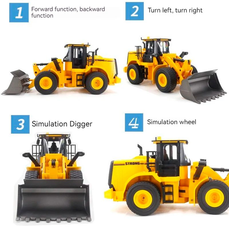 Полнофункциональный колесный бульдозер, ковш поднимается и опускается. Резиновые покрышки колес. Звуковые и световые эффекты.