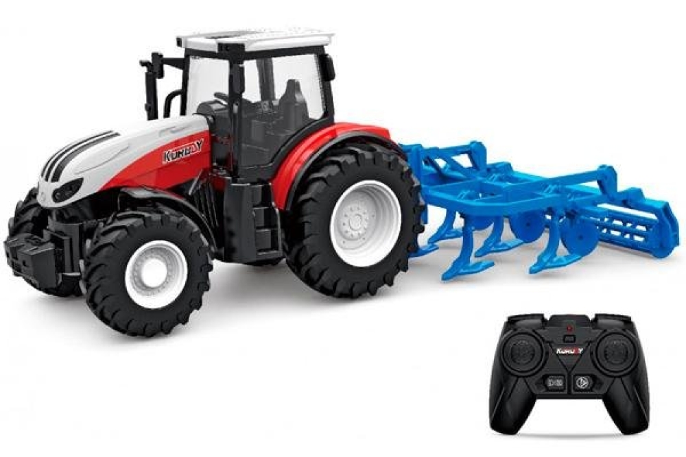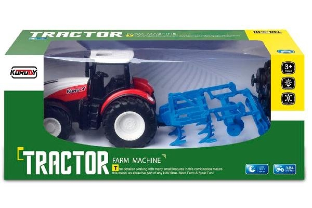 Колесный трактор на пульте управления. Масштаб 1:24 позволит вам использовать его не только дома, но и на открытом воздухе. Трактор способен разогнаться до 4 км/ч, а полное бездорожье не помешает вам по нему кататься. Большие мягкие резиновые колеса справятся с любой сложной задачей. Модель оснащается съемным прицепом - специализированной системой для вспахивания полей и подготовки почвы к сезонному посеву. Игра сопровождается световыми и звуковыми эффектами. Трактор имеет задний привод с дифференциалом и внедорожную резину.