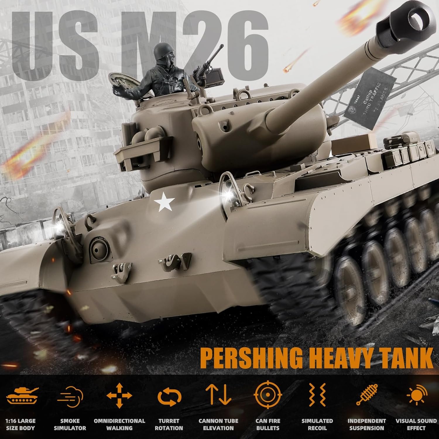 Помимо отличных характеристик, танк обладает реалистичными эффектами. Звуковые эффекты: включение выключение мотора, гул от его работы, стрельба из пулемета и основного орудия. Световые эффекты: вспышка при выстреле, передние фары, задние габариты. Кроме привычных эффектов у танка имеется дымогенератор, он производит специальный дым без запаха, который создает ощущение выхлопов работающего мотора.