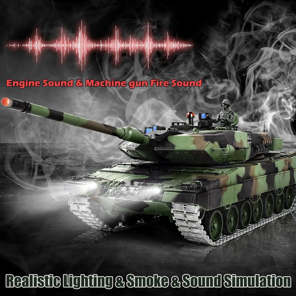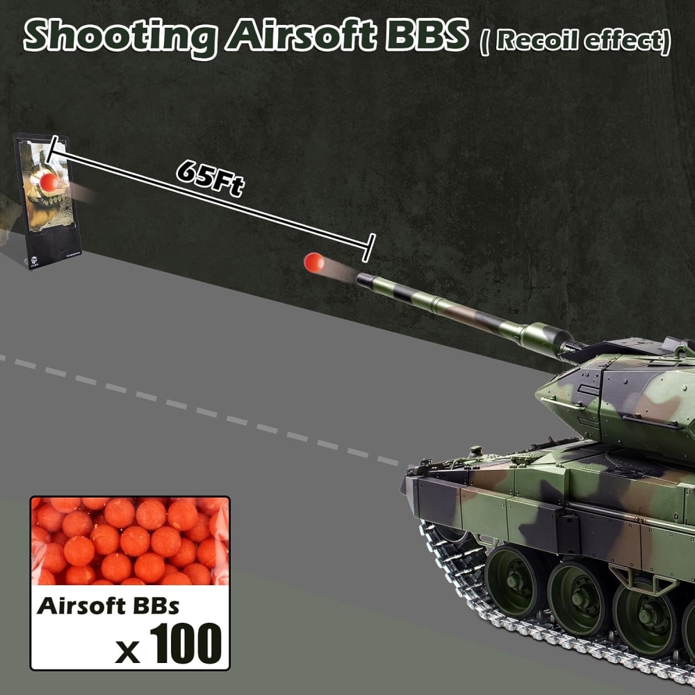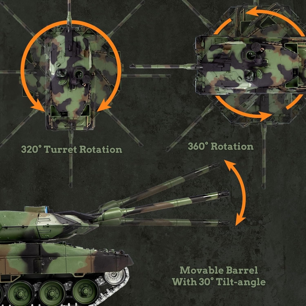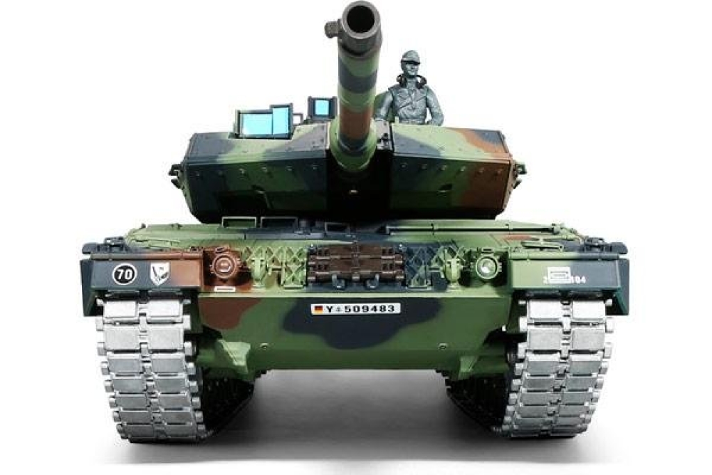 Немецкий современный танк, который стоит на вооружении и зарекомендовал себя мощной и надежной машиной. Модель повторяет настоящий танк с высокой детализацией, соблюдены даже не значительные детали - заклепки, навесное оборудование, горящие фары, установленный радар, антенна, тросы, запасные траки. Пушка стреляет шариками за счет пневмо механизма, а точность стрельбы обеспечит качественное наведение на цель. Башня вращается, а ствол двигается вверх и вниз. Из трубы глушителя идет дым, за это отвечает дымогенератор, куда требуется залить несколько капель глицерина (идет в комплекте).