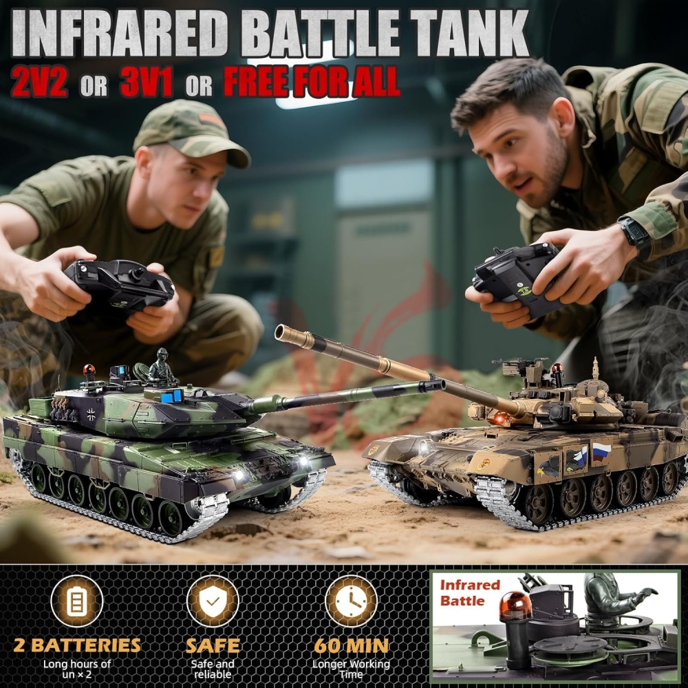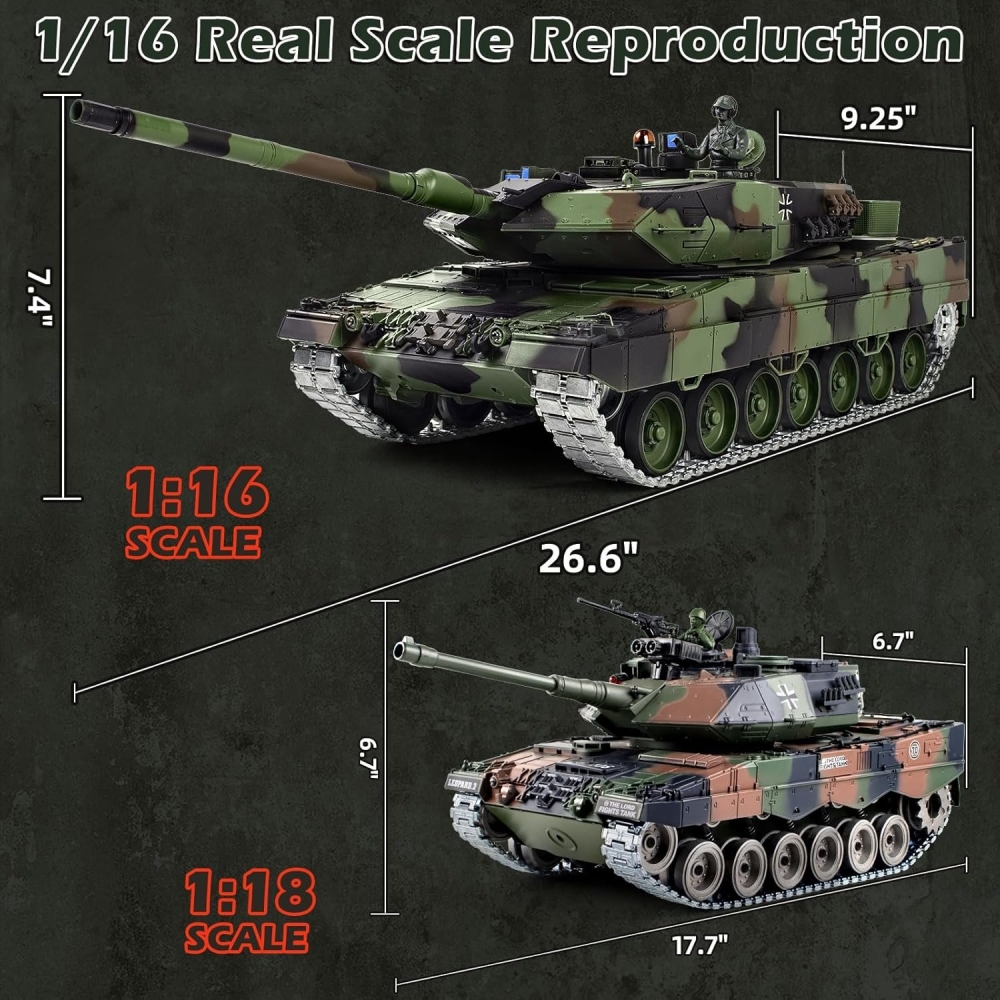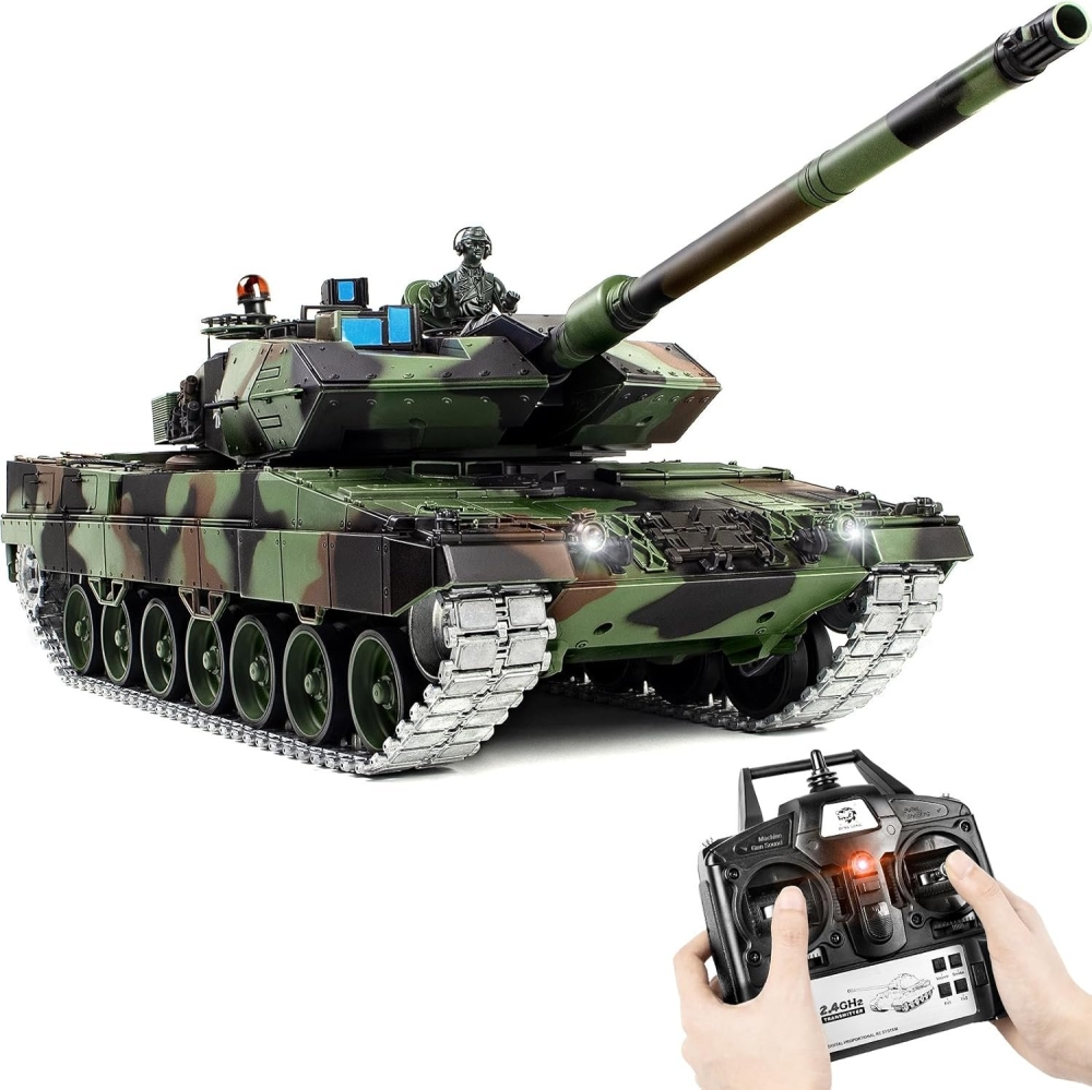 Немецкий современный танк, который стоит на вооружении и зарекомендовал себя мощной и надежной машиной. Модель повторяет настоящий танк с высокой детализацией, соблюдены даже не значительные детали - заклепки, навесное оборудование, горящие фары, установленный радар, антенна, тросы, запасные траки. Пушка стреляет шариками за счет пневмо механизма, а точность стрельбы обеспечит качественное наведение на цель. Башня вращается, а ствол двигается вверх и вниз. Из трубы глушителя идет дым, за это отвечает дымогенератор, куда требуется залить несколько капель глицерина (идет в комплекте).
