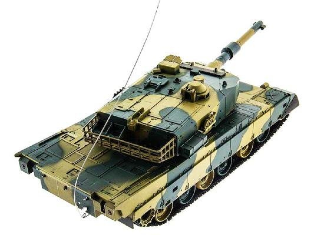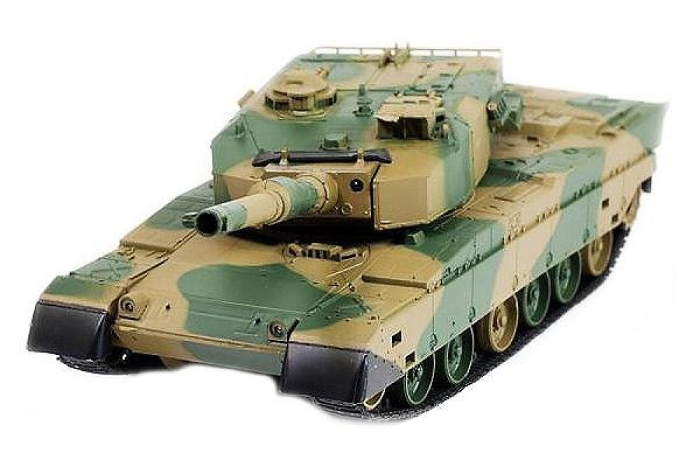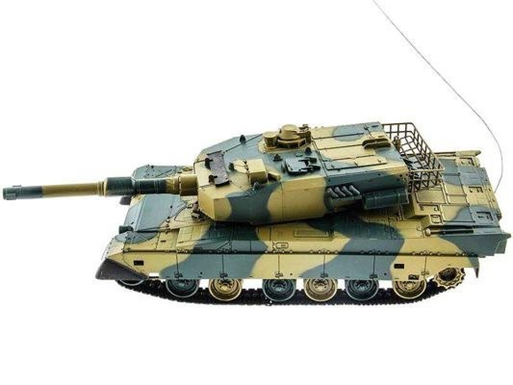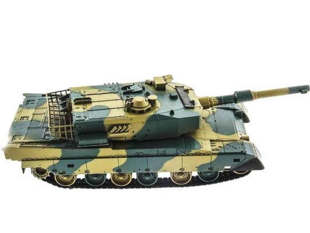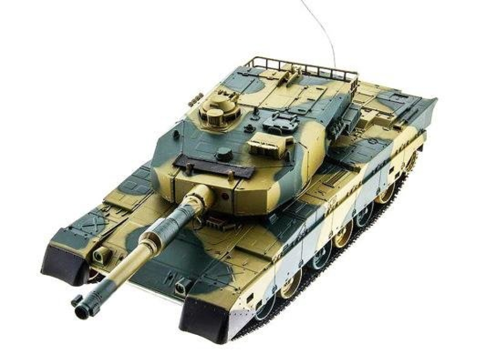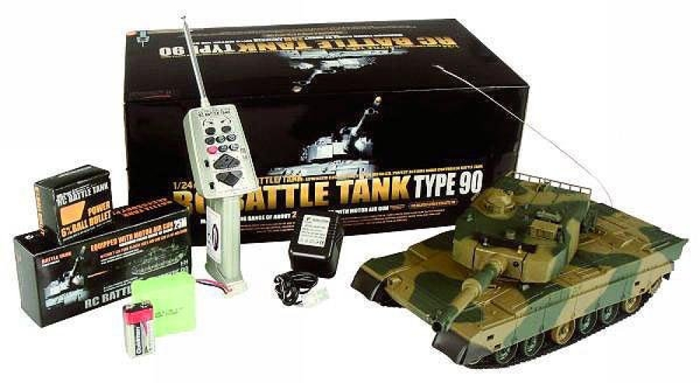 Модель японского танка Тип 90, разрабатывавшегося еще в 70-х годах прошлого века. Масштаб - 1:24. Модель изготовлена из прочного, противоударного пластика и очень хорошо детализирована, при выстрелах есть световая индикация. Стреляет модель из пневматической пушки на расстояние до 25 метров, пульками. Снаряды идут в комплекте, их 40 штук. Всего у модели 3 скорости движения, есть одна задняя передача. Для поворота влево-вправо скорости две, и одна - при поворотах и движении гусениц назад. Танк неплохо держится на наклонных поверхностях (до 35°) и может преодолевать несложные препятствия. Башня танка вращается на320°, ствол опускается и поднимается на 20°. Есть световые и звуковые эффекты - фонари и имитация стрельбы пулемета. У данной модели есть особенность - она оснащена силовым никель-кадмиевым аккумулятором емкостью 1000 мАч. Танк выдерживает час игры на полном заряде аккумулятора.