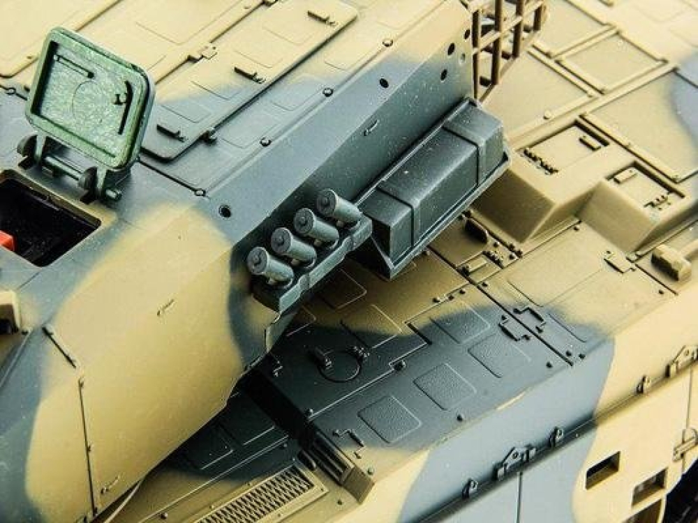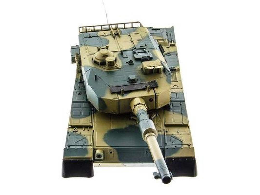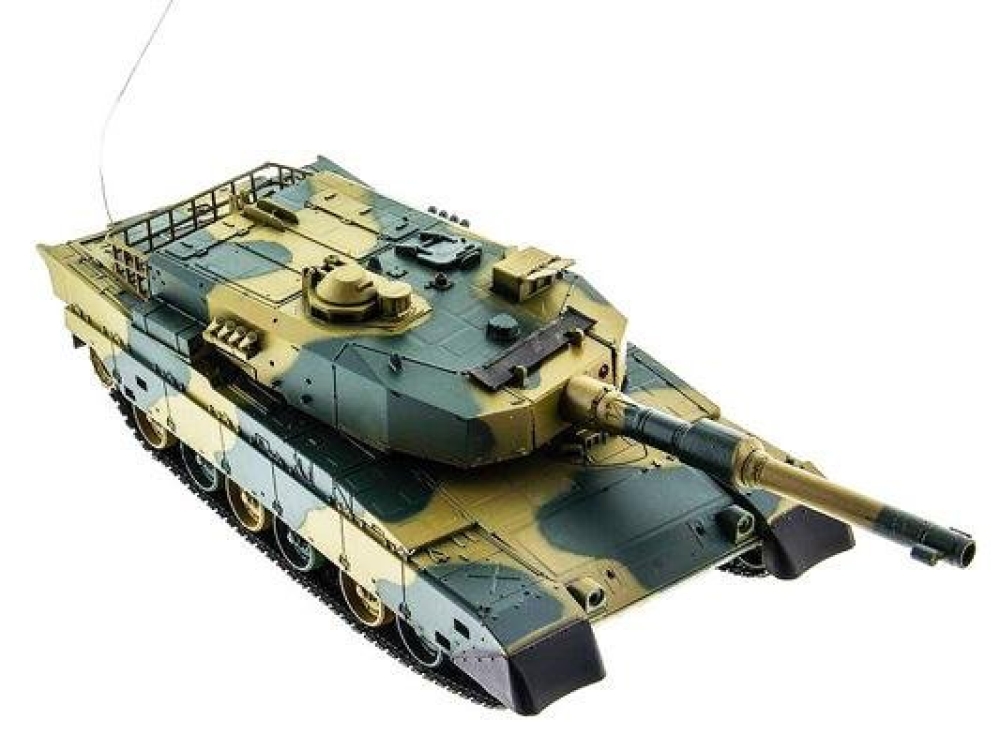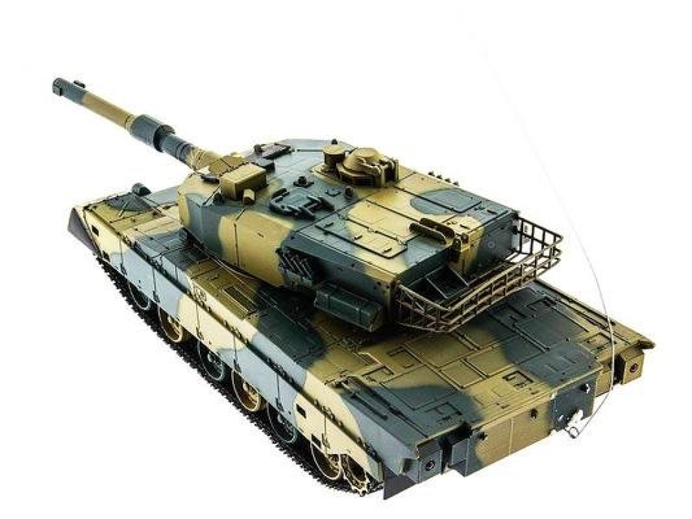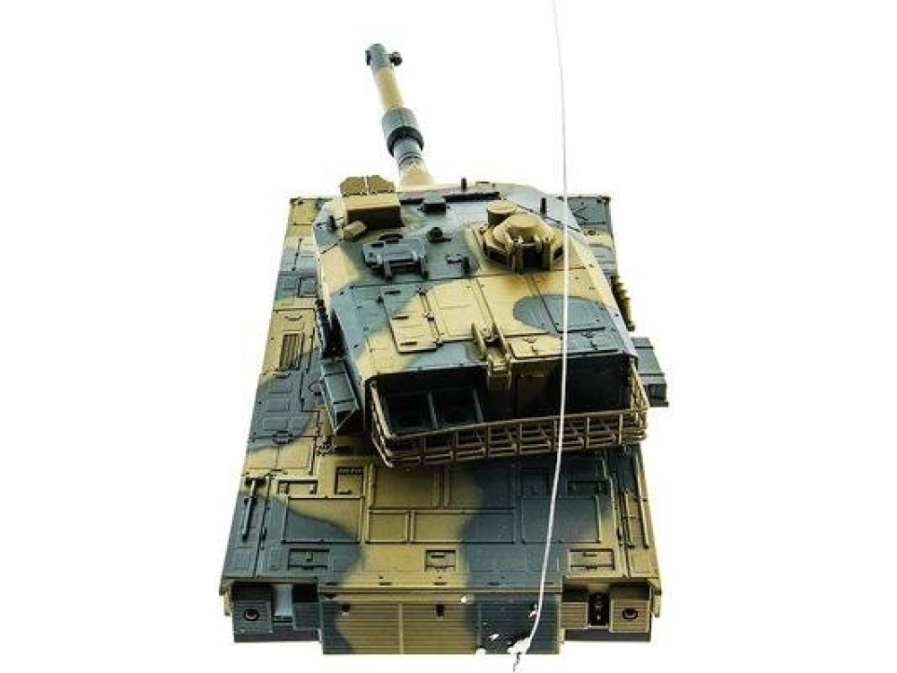 Модель японского танка Тип 90, разрабатывавшегося еще в 70-х годах прошлого века. Масштаб - 1:24. Модель изготовлена из прочного, противоударного пластика и очень хорошо детализирована, при выстрелах есть световая индикация. Стреляет модель из пневматической пушки на расстояние до 25 метров, пульками. Снаряды идут в комплекте, их 40 штук. Всего у модели 3 скорости движения, есть одна задняя передача. Для поворота влево-вправо скорости две, и одна - при поворотах и движении гусениц назад. Танк неплохо держится на наклонных поверхностях (до 35°) и может преодолевать несложные препятствия. Башня танка вращается на320°, ствол опускается и поднимается на 20°. Есть световые и звуковые эффекты - фонари и имитация стрельбы пулемета. У данной модели есть особенность - она оснащена силовым никель-кадмиевым аккумулятором емкостью 1000 мАч. Танк выдерживает час игры на полном заряде аккумулятора.