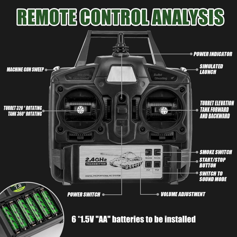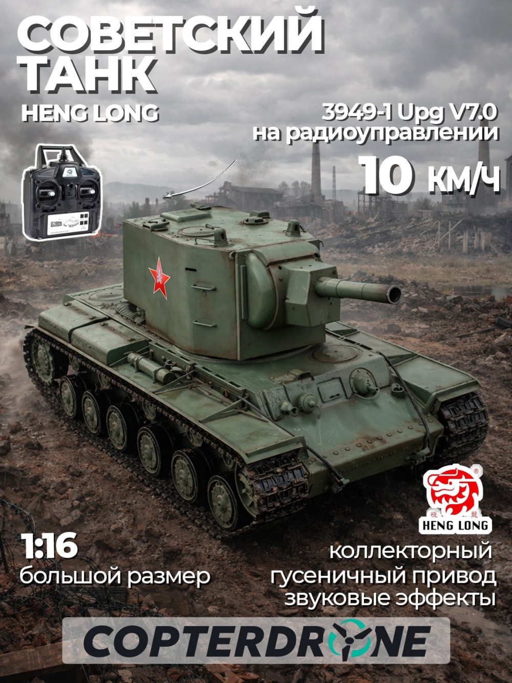Обновлённая версия знаменитого советского танка Heng Long Russia KV-2 7-й версии. Главное отличие от предыдущей версии это более высокое качество сборки и электроники. Пневматическая пушка стреляет пластиковыми шариками (40шт помещается в емкость для шариков) на расстояние прицельного выстрела 15-20 метров. При стрельбе происходит откат, как у настоящего танка. Дым машина и звуковая система имитируют работу орудия во время движения и стрельбы. Время игры составляет около 30-40 минут, а зарядка 4-6 часов.