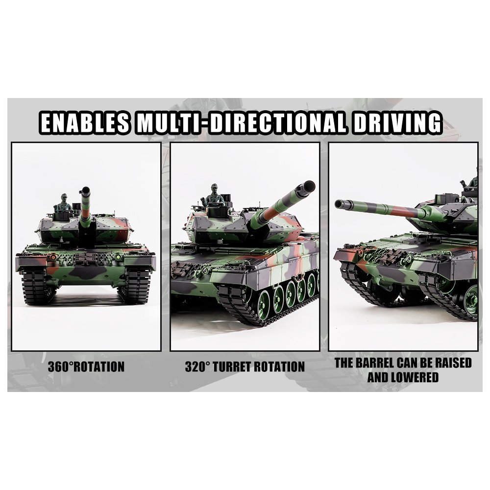 Радиоуправляемый танк Heng Long Leopard 2 A6 приближен к своей реальной копии танка. Оснащен пневматической и ик-пушками. Танк Heng Long совершает движения вперед и назад на 2-х скоростях, разворот на 360, вращающаяся башня с поднимающимся-опускающимся дулом.