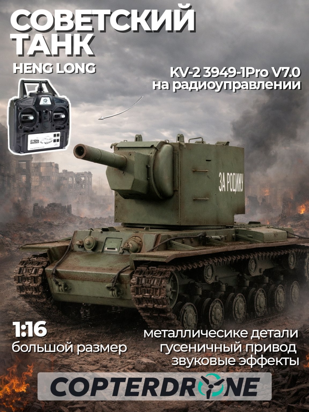 Обновлённая версия знаменитого советского танка Heng Long Russia KV-2 7-й версии. Главное отличие от предыдущей версии это более высокое качество сборки и электроники. Пневматическая пушка стреляет пластиковыми шариками (40шт помещается в емкость для шариков) на расстояние прицельного выстрела 15-20 метров. При стрельбе происходит откат, как у настоящего танка. Дым машина и звуковая система имитируют работу орудия во время движения и стрельбы. Время игры составляет около 30-40 минут, а зарядка 4-6 часов.