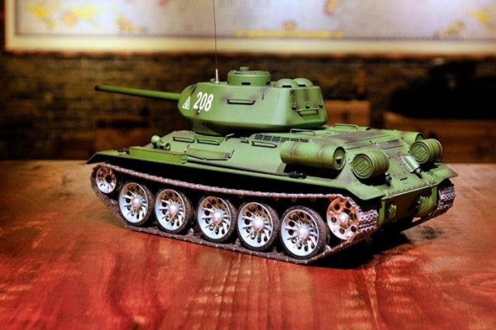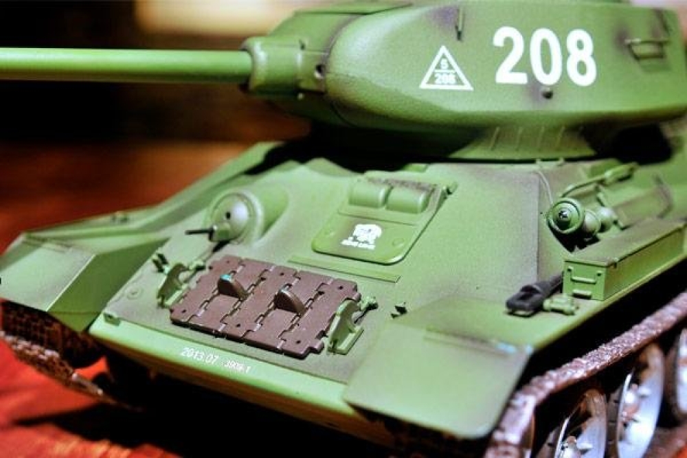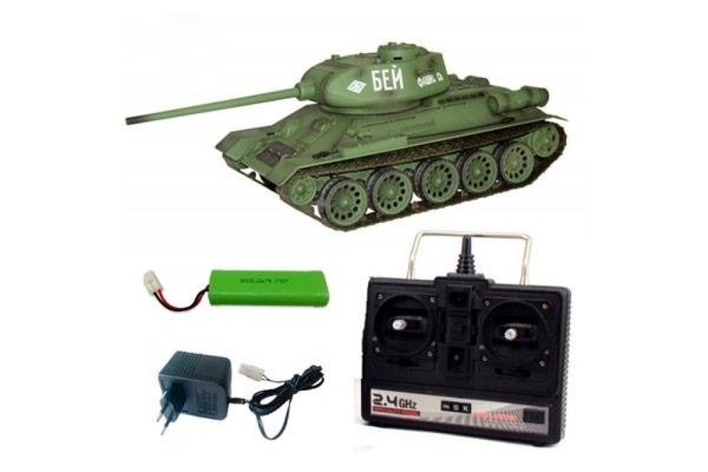 Обновлённая версия знаменитого советского танкаHeng Long Russia T34-85 6-й версии. Главное отличие от предыдущей версии это более высокое качество сборки и электроники. Пневматическая пушка стреляет пластиковыми шариками (40шт помещается в емкость для шариков) на расстояние прицельного выстрела 15-20 метров. При стрельбе происходит откат, как у настоящего танка. Дым машина и звуковая система имитируют работу орудия во время движения и стрельбы. Время игры составляет около 30-40 минут, а зарядка 4-6 часов.