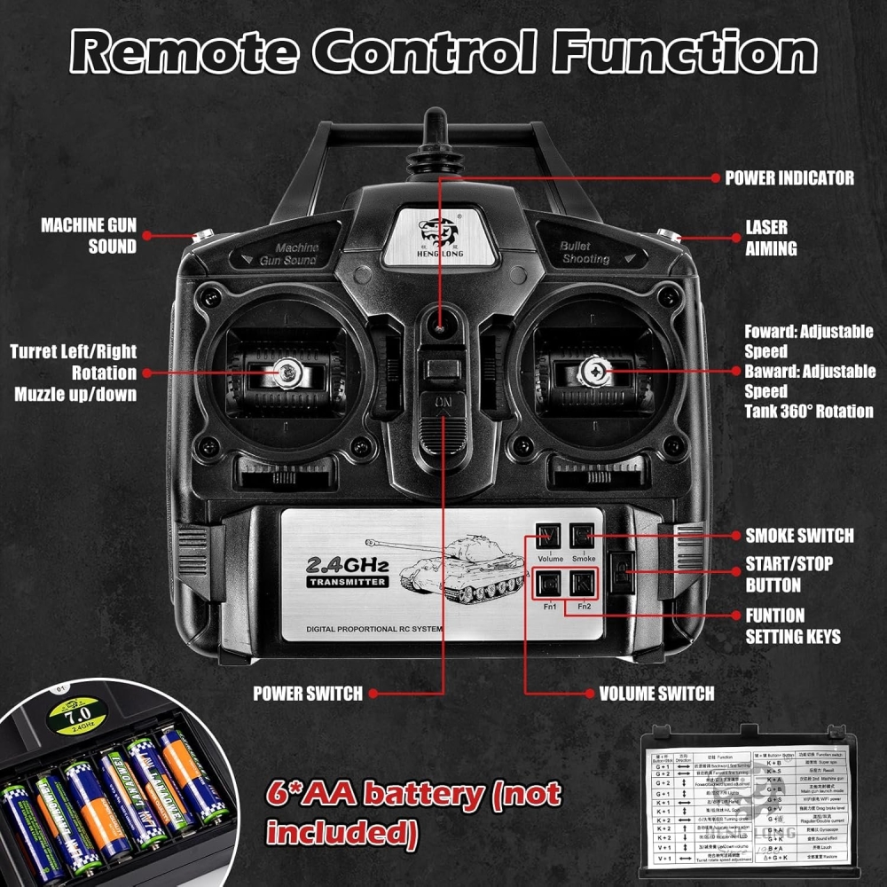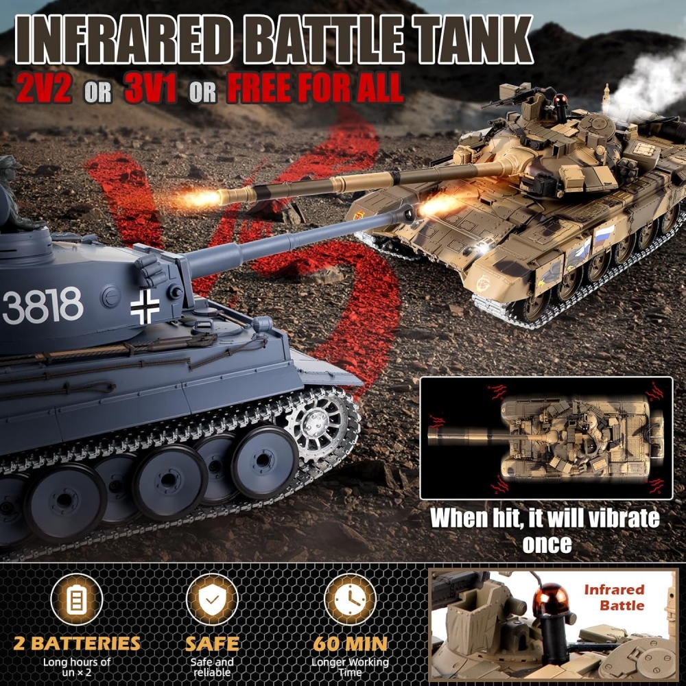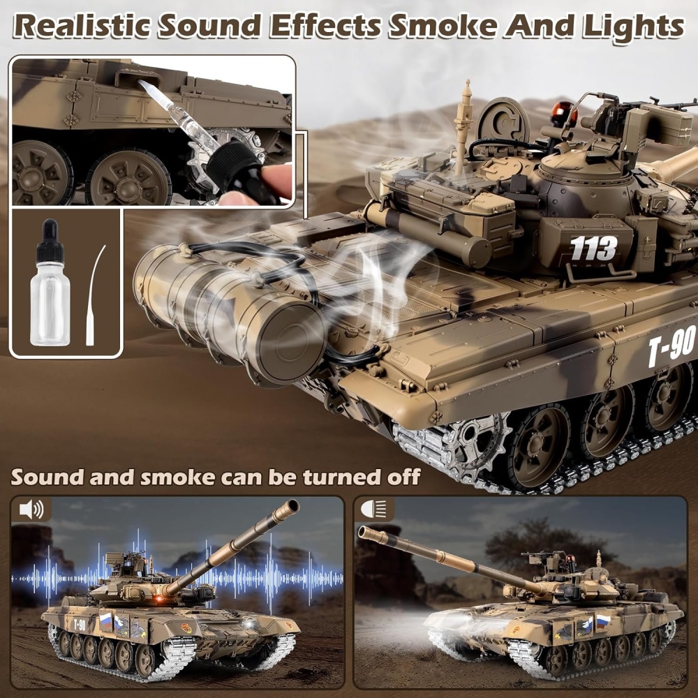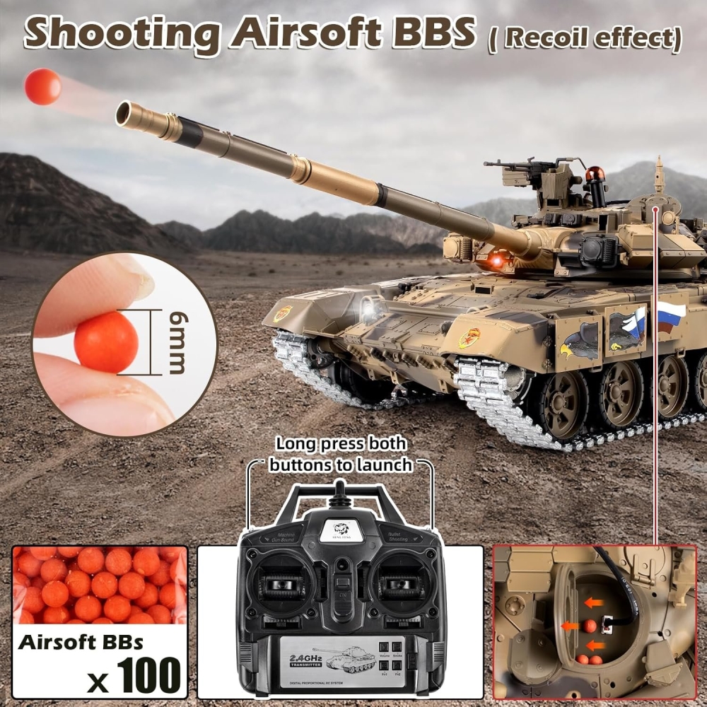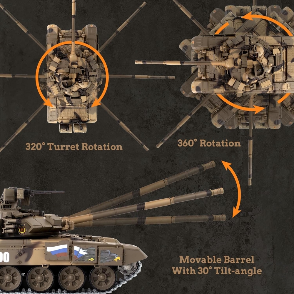 Радиоуправляемый танк Heng Long Type 90 Pro - это расширенная знаменитого российского танка версия 7.0. Она включает в себя металлические гусеницы, ленивцы, катки, а также внутренние детали. За счёт этого модель невероятно прочная и долговечная, даже при прохождении полного бездорожья. Башня танка вращается на 320 градусов. Он ездит и поворачивается во всех направлениях. Имеет мягкую троссионную подвеску, которую можно регулировать (натяжение гусениц). Модель имеет стреляющую пушку которая заряжается пластиковыми шариками, прицельная дальность выстрела до 15 м. Это обновлённая версия на которую установлена также инфракрасная пушка, поэтому вы сможете устраивать танковые бои при наличии 2 танка. Heng Long 90 имеет в своём оснащении также дым машину, которая создаёт имитацию выхлопных газов во время движения. При выстреле происходит имитация отдачи, танк откатывается назад. Он оборудован звуковой системой, которая в точности имитирует звуки езды, выстрелов, поворота башни и многих других. Игровое время составит более 30 минут при дальности действия 30 м. Танк изготовлен по лицензии и с точной детализацией, у него открывается множество люков и дверок: