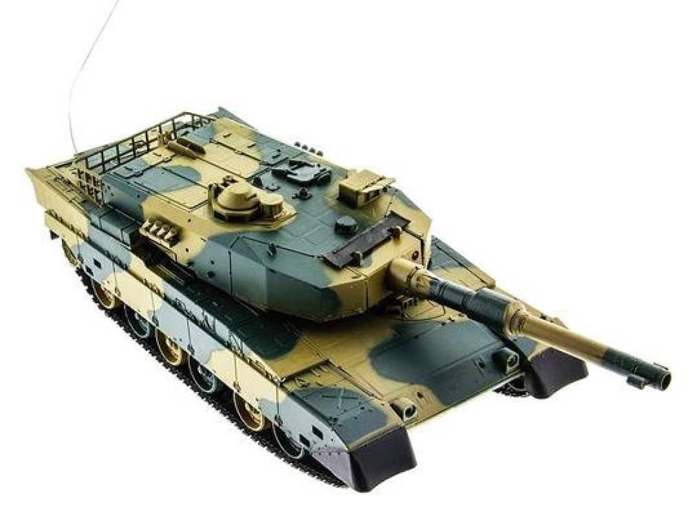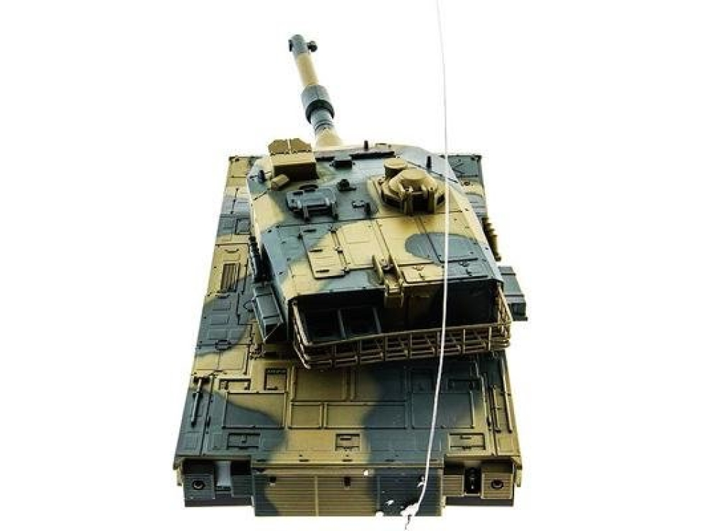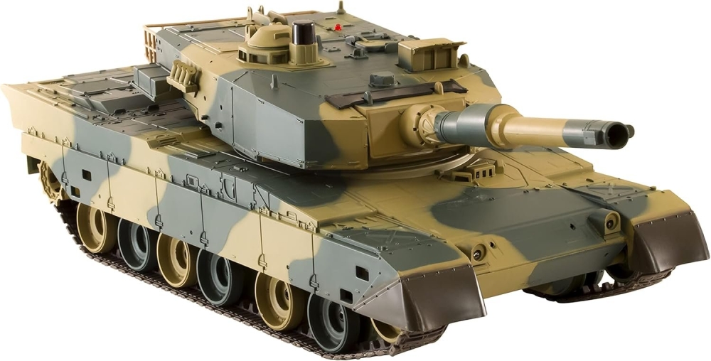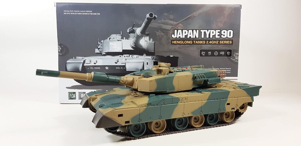 Модель японского танка Тип 90 с технологией закручивания шарика во время выстрела - "Hop Up". Эта технология позволяет данной модели довольно точно стрелять пульками на расстояние до 25 метров. У модели две скорости для поворота влево-вправо, и одна - при поворотах и движении гусениц назад. Танк неплохо держится на наклонных поверхностях (до 35°) и может преодолевать несложные препятствия. Башня танка вращается на320°, ствол опускается и поднимается на 20°. Есть световые и звуковые эффекты - фонари и имитация стрельбы пулемета. Танк выдерживает час игры на полном заряде аккумулятора. Материал из которого изготовлена модель - пластик.