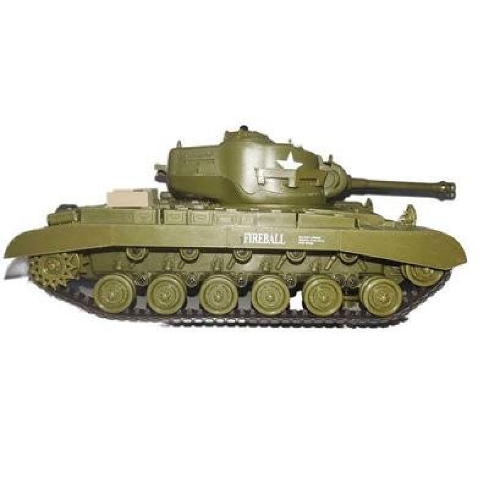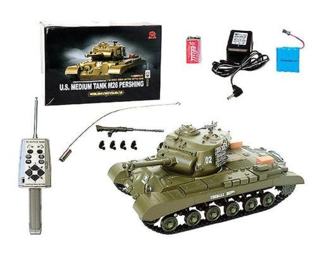 Британский Першинг с ИК-пушкой, предназначенный для игры в танковый бой: модель оборудована системой инфракрасных датчиков. Высокая степень детализации, корпус с навесным оборудованием. В набор также входят наклейки для корпуса. Танк может переключаться между двумя скоростями. Башня вращается на 320 градусов, пушку можно поднять или опустить на 20 градусов прямо на ходу танка, стрельба ведется на расстоянии до 3-х метров. Подвеска колес независимая. Материал, из которого изготовлен танк - пластик.
