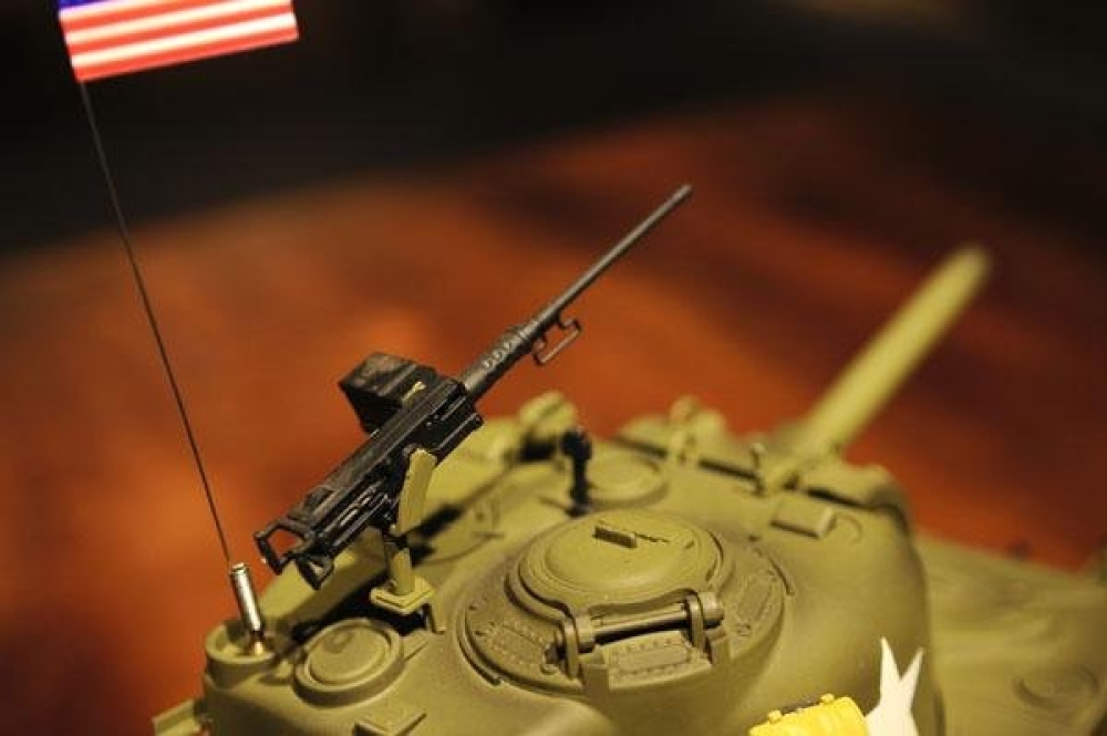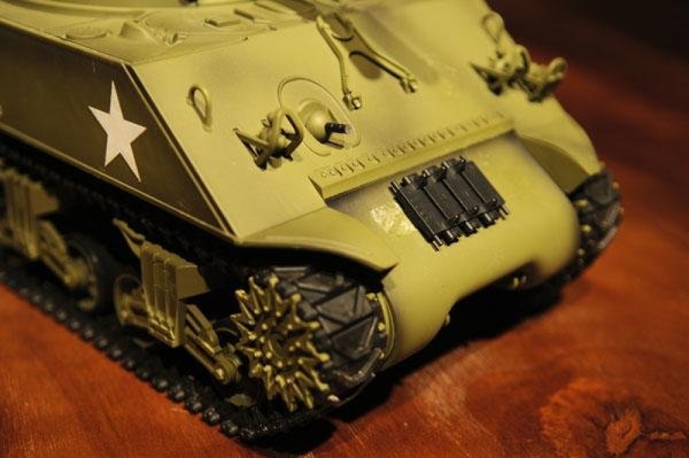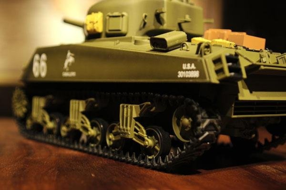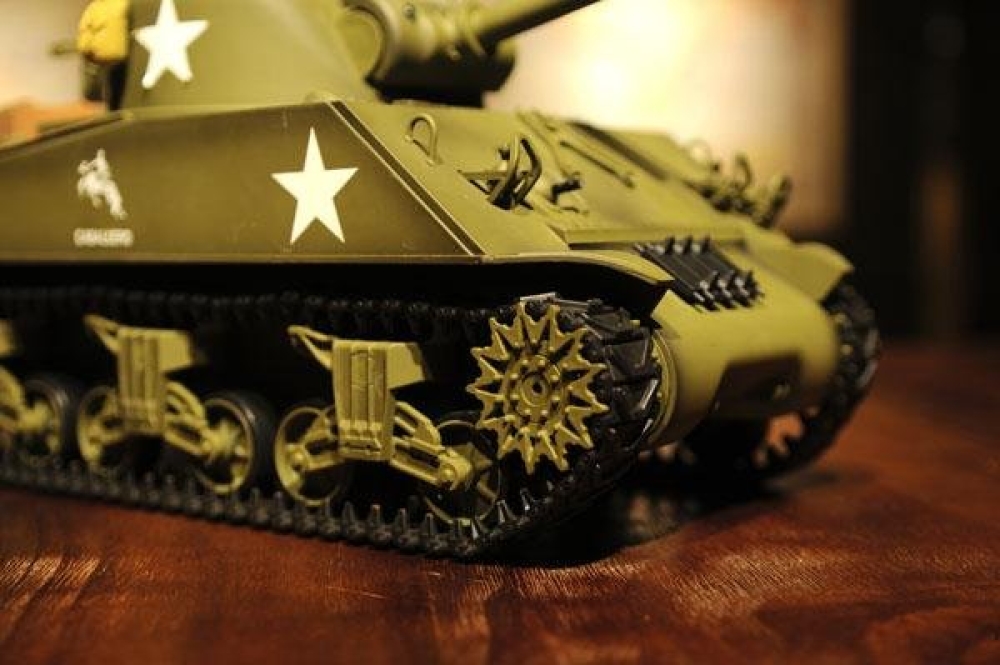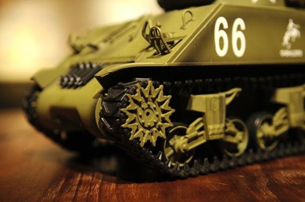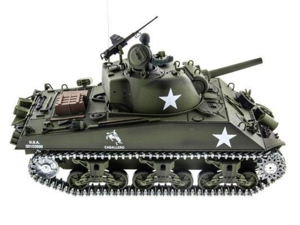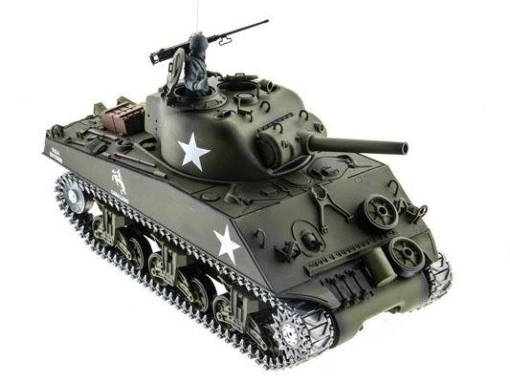 Точная копия американского танка 2-й мировой войны, M4A3 Sherman выпускался с 1940 года и учувствовал во многих знаменательных боях на территории западной Европы. Модель полностью функциональна, ездит во всех направлениях и поворачивается на месте. Башня танка вращается, а ствол опускается и поднимается. Установленная дым машина имитирует выхлоп, за счет глицерина из трубы идет дым.
