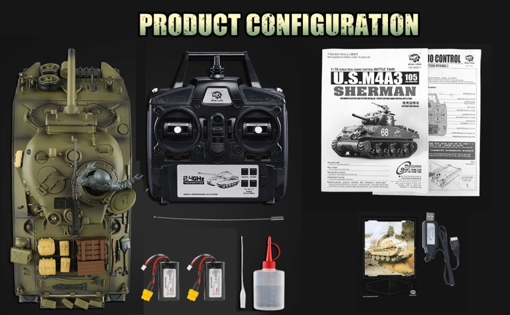 Модель комплектуется: аккумулятор, упаковка 6-миллиметровых шариков ВВ (200 штук), мишень, масло для дымовых эффектов, фигурка танкиста и различные пластиковые навесные аксессуары