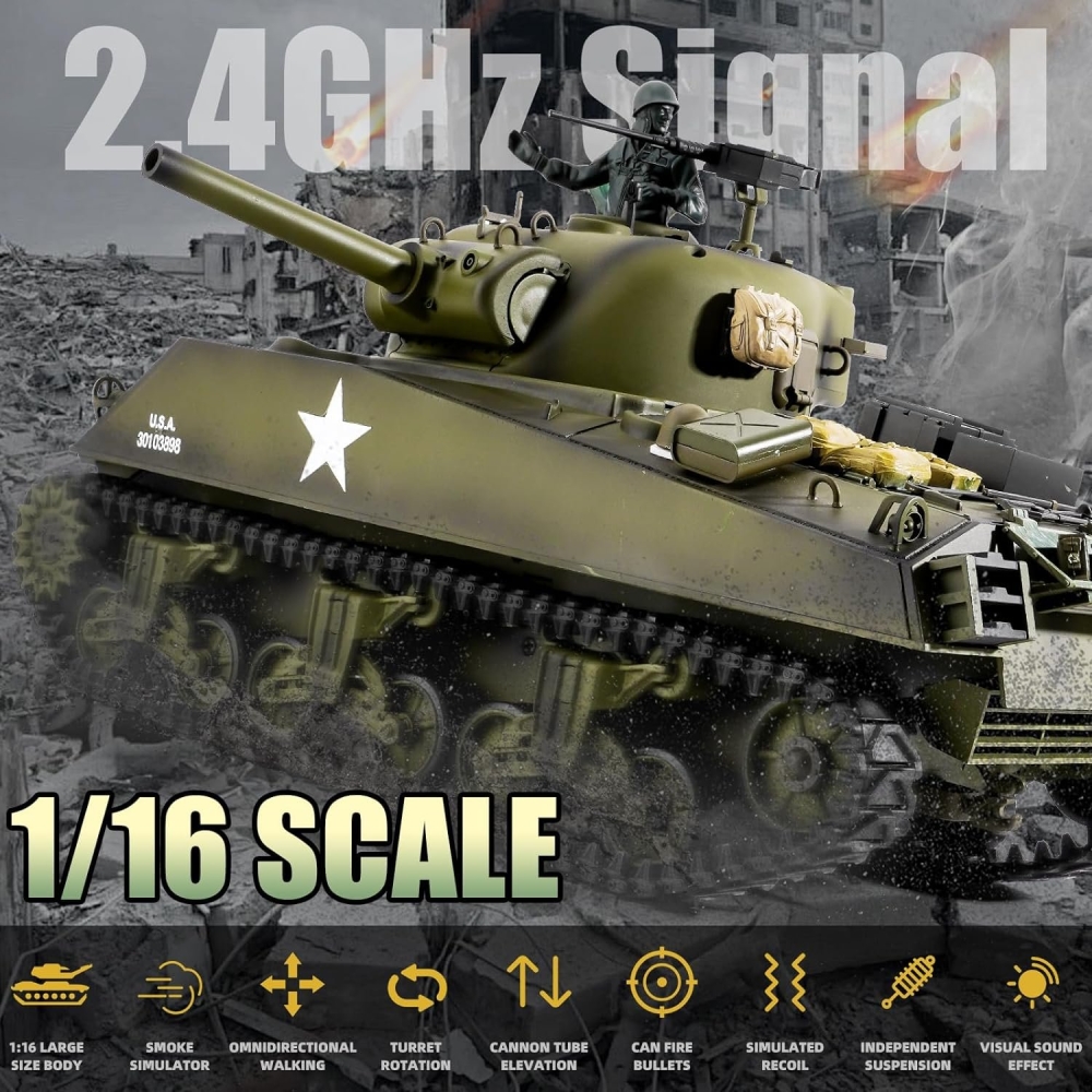 3898-1 V7.0 Американский военный танк времен Второй Мировой войны, названый в честь легендарного генерала армии США Уильяма Текумсе Шермана. Боевая машина участвовала во многих сражениях, а основными операторами являлись США, Советский Союз и Великобритания. Всего было выпущено 49 тысяч штук. Версия 6.0 означает, что вы можете участвовать в боях с другими танками посредством инфракрасных датчиков.