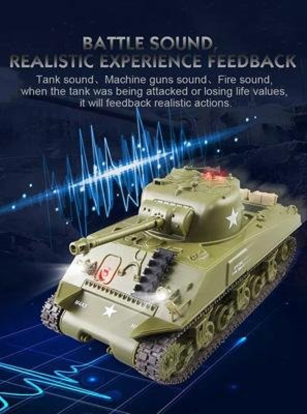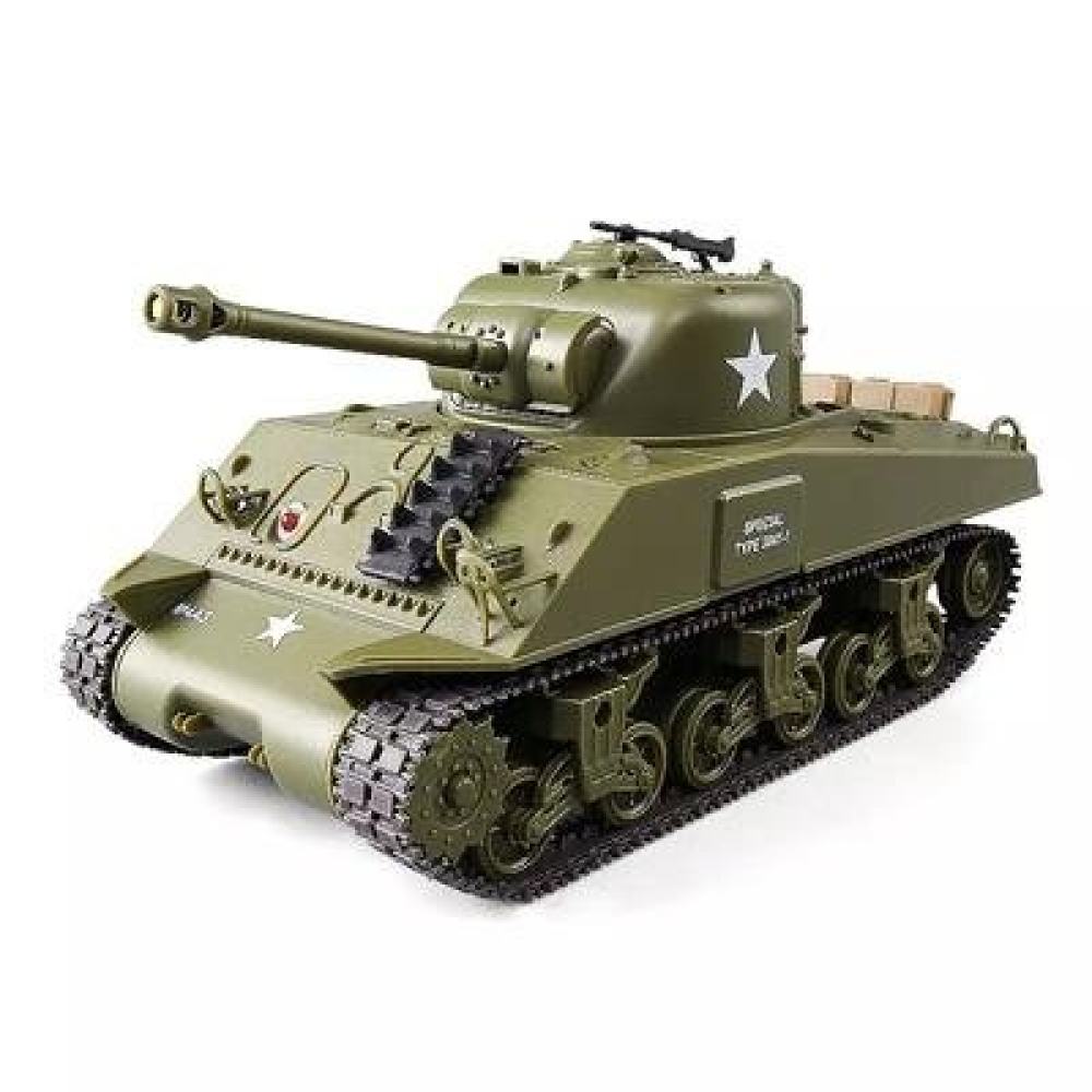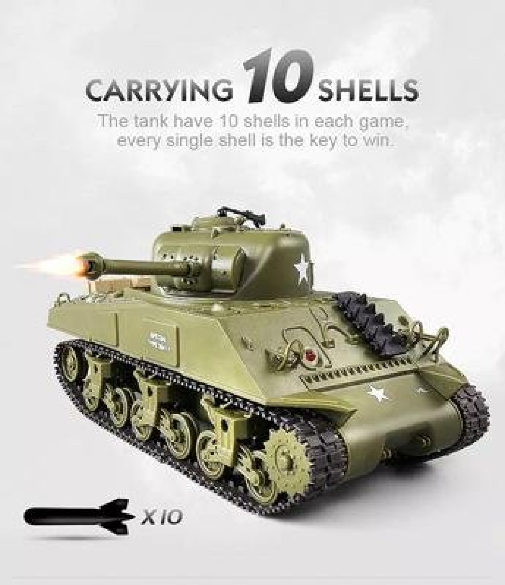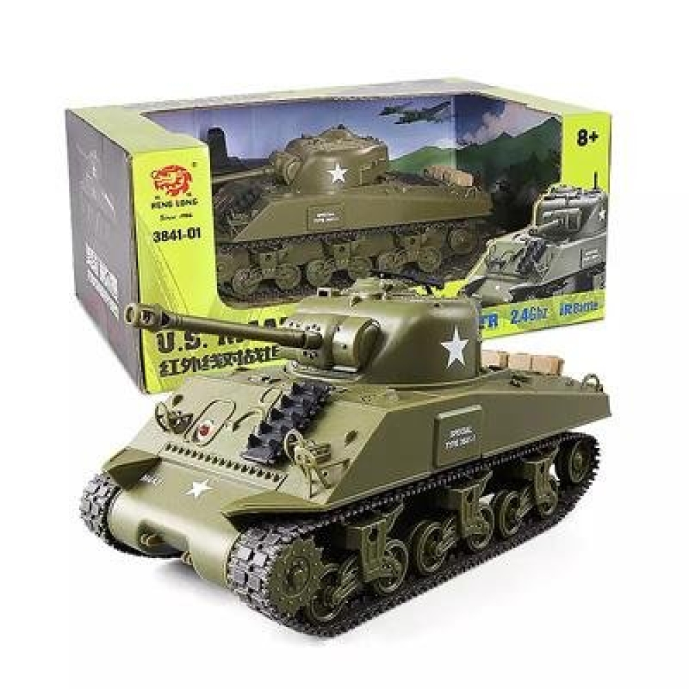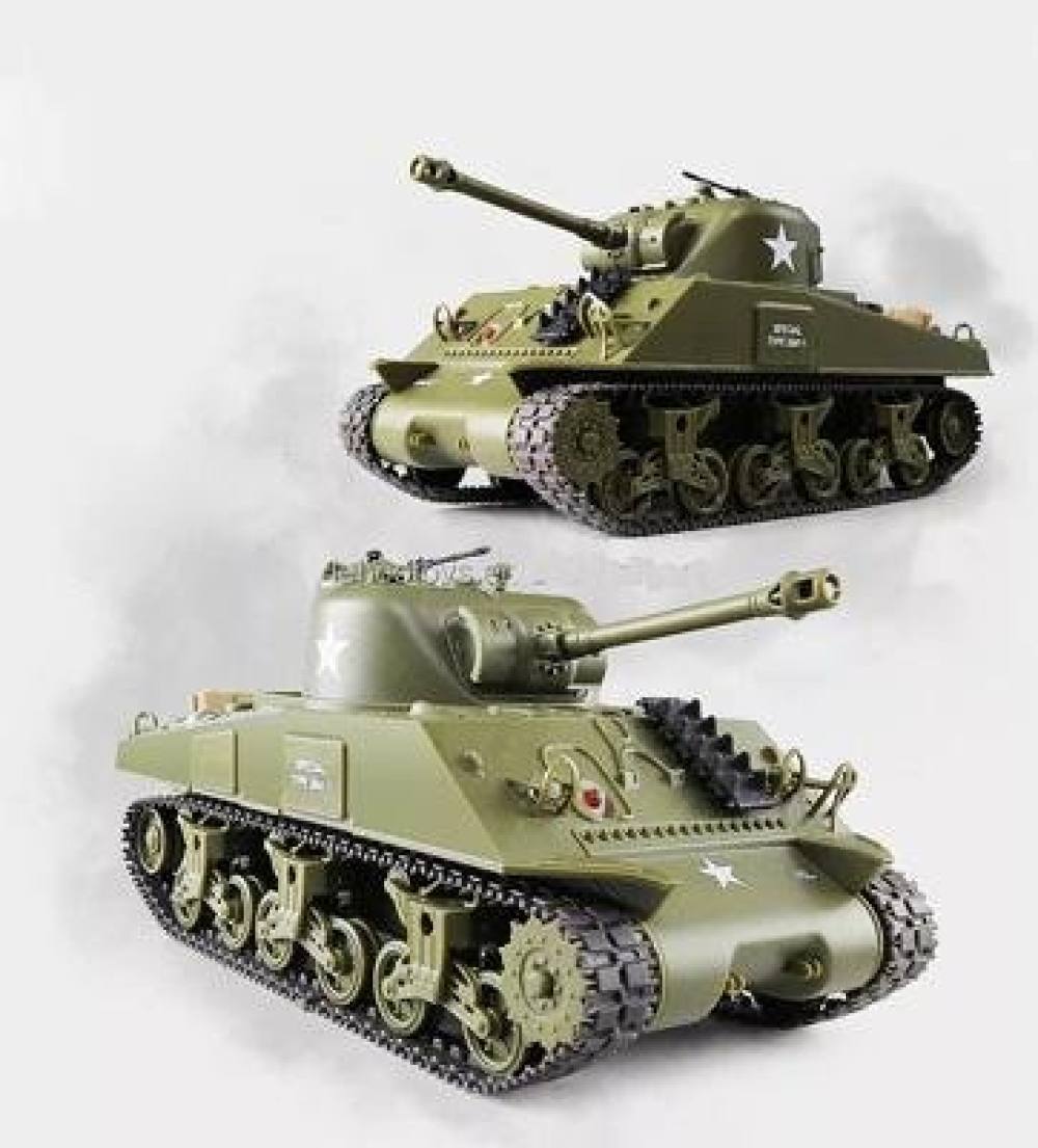 Британский Шерман с ИК-пушкой, предназначенный для игры в танковый бой: модель оборудована системой инфракрасных датчиков. Высокая степень детализации, корпус с навесным оборудованием. В набор также входят наклейки для корпуса. Танк может переключаться между двумя скоростями. Башня вращается на 320 градусов, пушку можно поднять или опустить на 20 градусов прямо на ходу танка, стрельба ведется на расстоянии до 3-х метров. Подвеска колес независимая. Материал, из которого изготовлен танк - пластик.