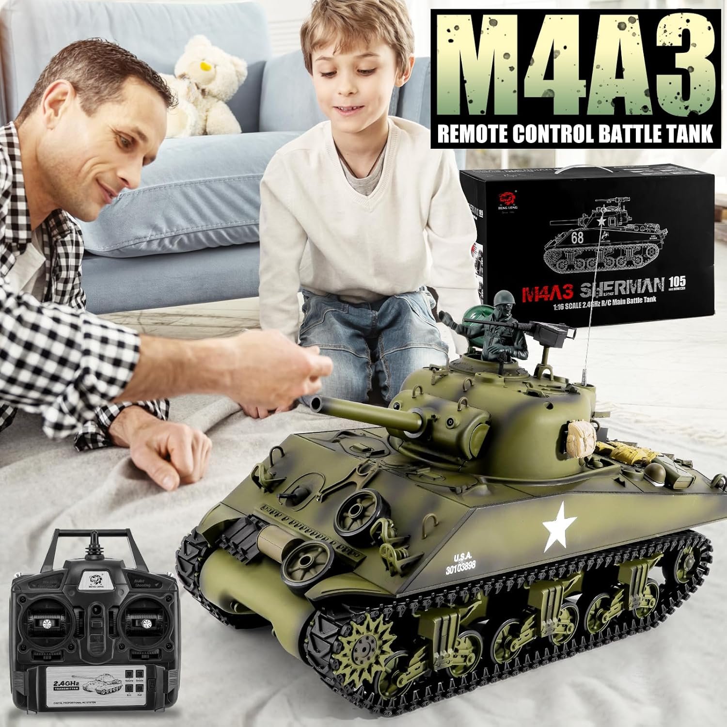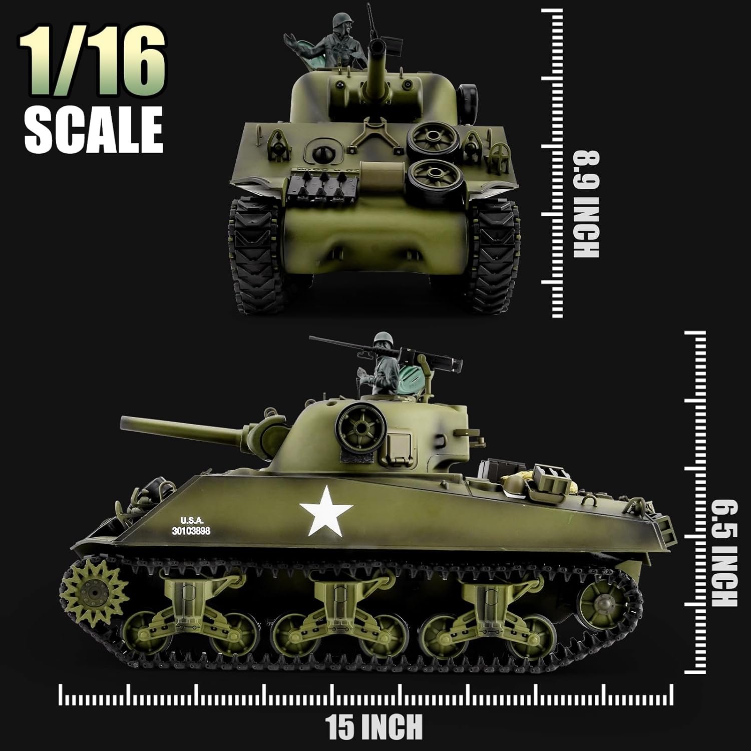 Самый выпускаемый танк армии США, который принимал участие на всем протяжении второй мировой войны. Upgrade версия, в отличие от стандартной, имеет цинковую ведущую шестерню, что продлит срок службы. Башня танка и ствол двигаются в нескольких направлениях, что позволяет сделать точный выстрел на расстояние до 15 метров. Пневмопушка стреляет пластиковыми шариками 6мм, в магазин помещается 30-40 штук. Танк имеет большое количество навесного оборудования - запасные катки, топор и лопата, щипцы и различные ящики. Модель выполнена в большом масштабе 1:16 и может эксплуатироваться как дома, так и на улице, преодолевая серьезные преграды на бездорожье.