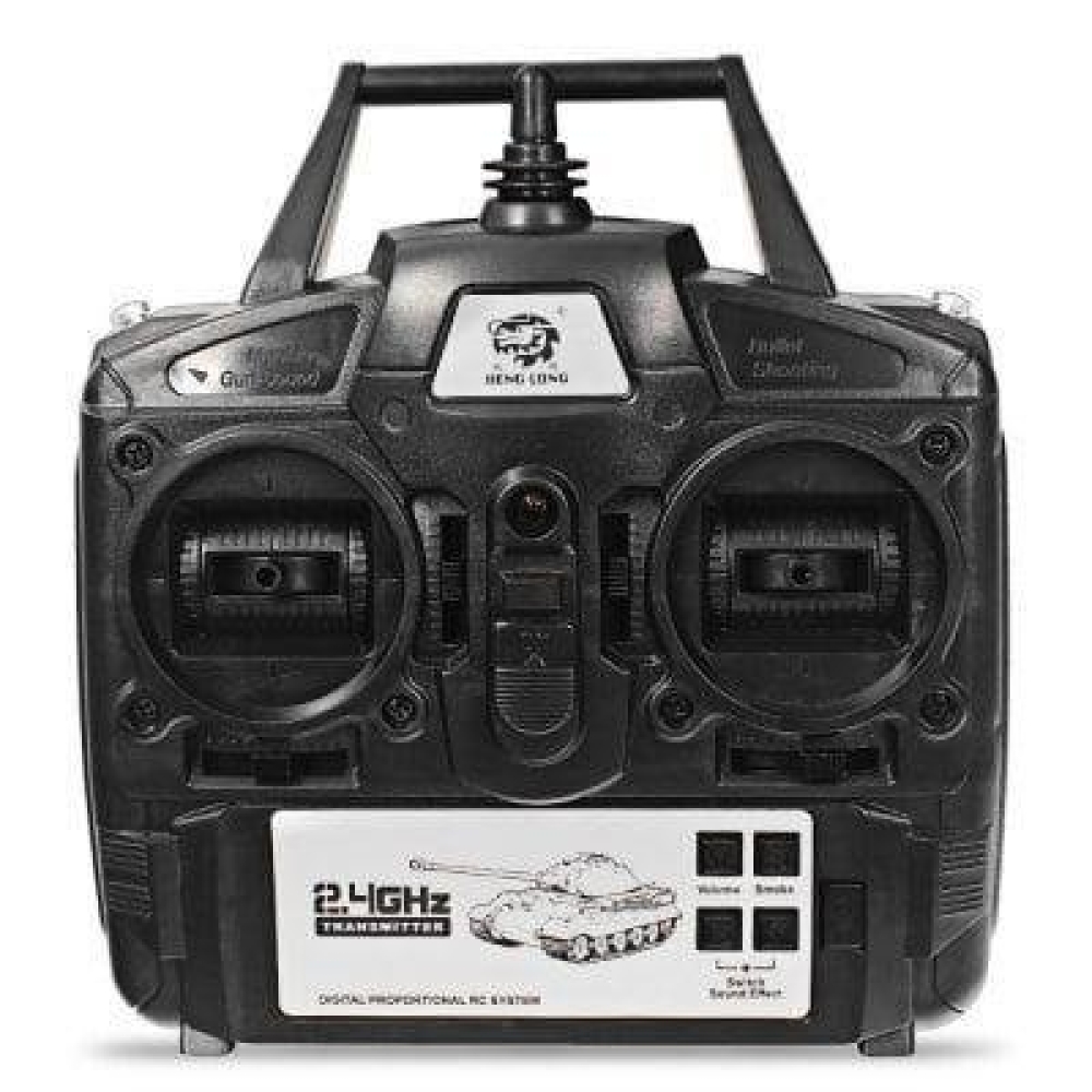Танк имеет большой размер и высокую детализацию кузова, башни и шасси. Имеет в своем вооружении 2 пушки. Первая пневмо - стреляет пластиковыми шариками с прицельным попаданием до 10 метров. Вторая - инфракрасная, можно устраивать танковые бои, например, с Т-34. Вдобавок есть звуковая имитация выстрелов пулемета. При выстреле из основной пушки происходит откат орудия и раздается характерный звук выстрела. Внутри корпуса спрятана дым машина, которая имитирует выхлоп мотора. Башня поворачивается на 345 градусов, а ствол двигается вверх и вниз. В наборе идет различное навесное оборудование - запасные траки, буксировочные тросы, а также фигурка водителя. Все люки танка открываются.
