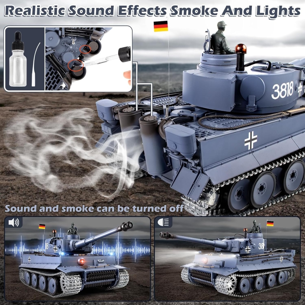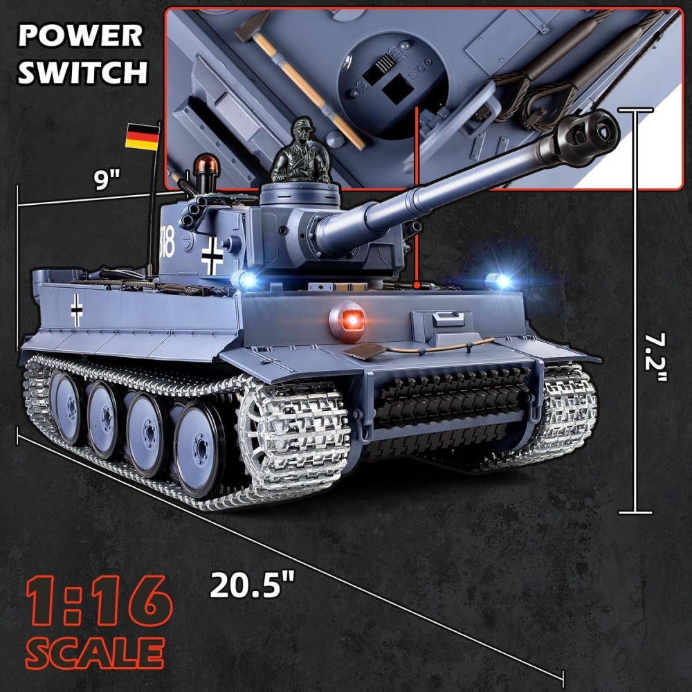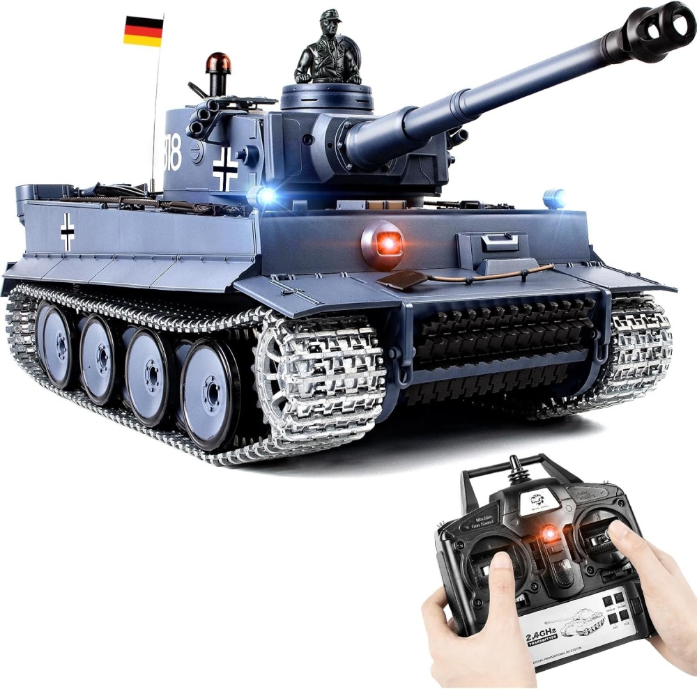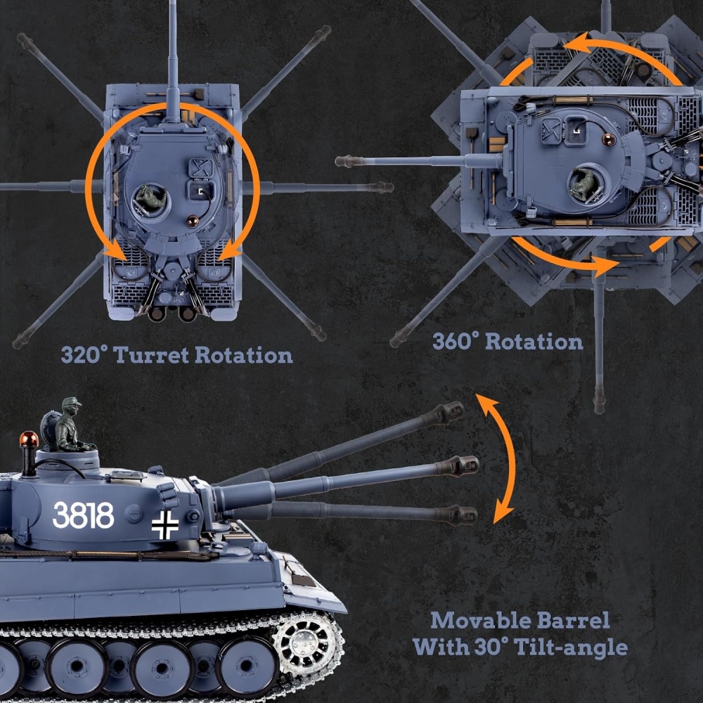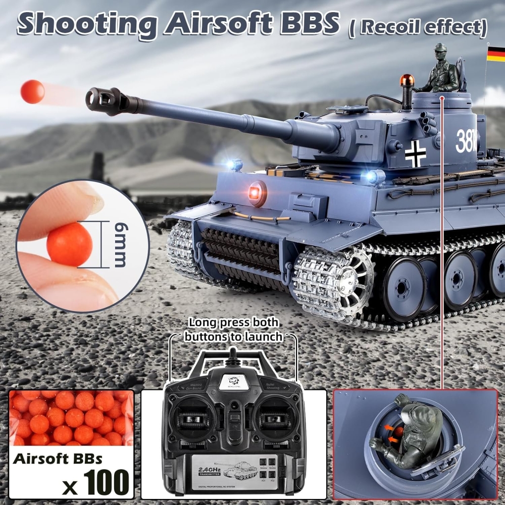 Топовая версия немецкого танка. Имеет в своем вооружении 2 пушки. Пневмо стреляет пластиковыми шариками с прицельным попаданием до 10 метров. Дополнительная инфракрасная- можно устраивать танковые бои, например. Вдобавок есть звуковая имитация выстрелов пулемета. При выстреле из основной пушки происходит откат орудия и раздается характерный звук выстрела. Внутри корпуса спрятана дым машина, которая имитирует выхлоп мотора. Башня поворачивается на 345 градусов, а ствол двигается вверх и вниз. В наборе идет различное навесное оборудование - запасные траки, буксировочные тросы, а также фигурка водителя. Все люки танка открываются.