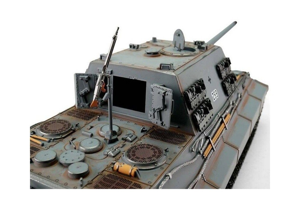 Модель полностью готова к работе, филигранно раскрашена и имеет все необходимые аксессуары для эксплуатации. Инфракрасная пушка, выхлопные трубы оборудованы дым - системой, движение модели сопровождается звуковой имитацией работы двигателя! На модели светятся фары, ствол откланяется вверх/вниз. Работающая подвеска катков, лязг гусениц заставляют поверить в реальность происходящего!