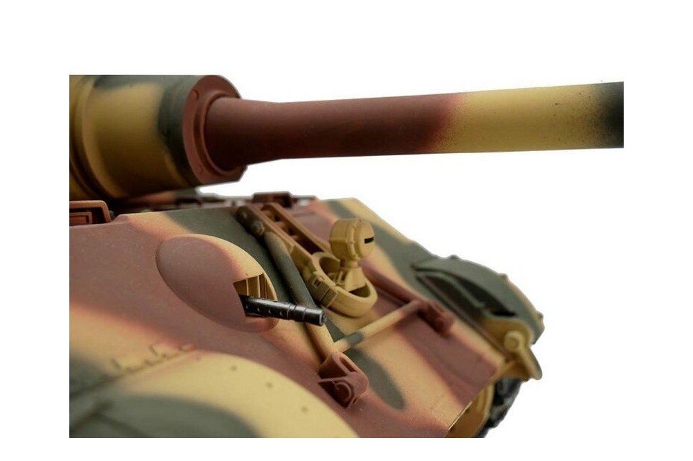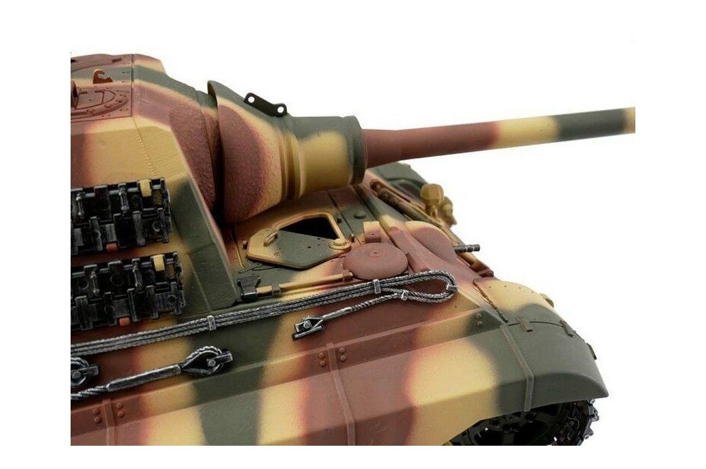 Модель полностью готова к работе, филигранно раскрашена и имеет все необходимые аксессуары для эксплуатации. ВВ-пушка, выхлопные трубы оборудованы дым - системой, движение модели сопровождается звуковой имитацией работы двигателя! На модели светятся фары, ствол откланяется вверх/вниз. Работающая подвеска катков, лязг гусениц заставляют поверить в реальность происходящего!