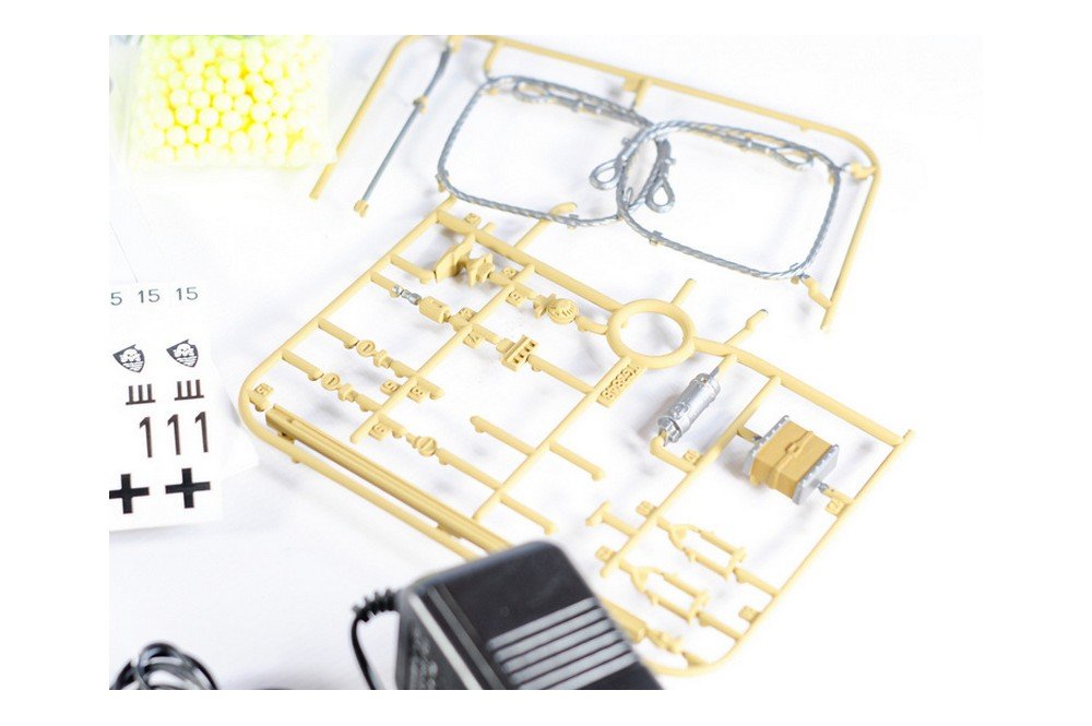Комплектация | Танк, пульт управления 2.4G, аккумулятор, зарядное устройство, масло для дымовой машины, набор для ремонта гусениц, комплект наклеек и аксессуаров |