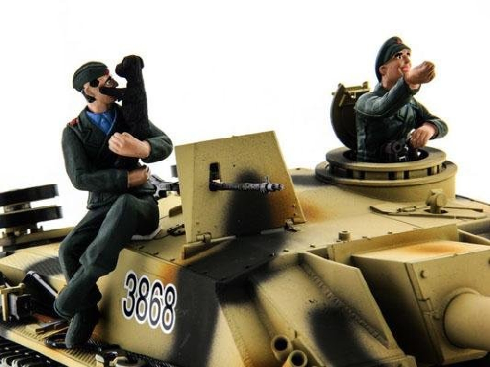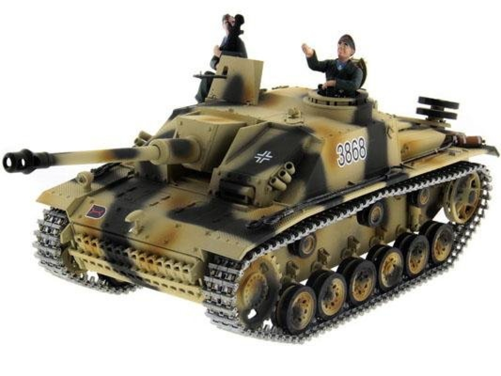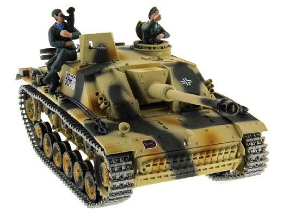 Точная копия легкого танка - штурмового орудия StuG III. Данная модель имеет стальное днище, металлические гусеницы, приводные катки, ленивцы и башню. Стреляет до 20 метров с помощью пневматической пушки. Имеет звуковую систему, имитирующую выстрелы и звук мотора, а также выхлопную систему из которой идет дым.