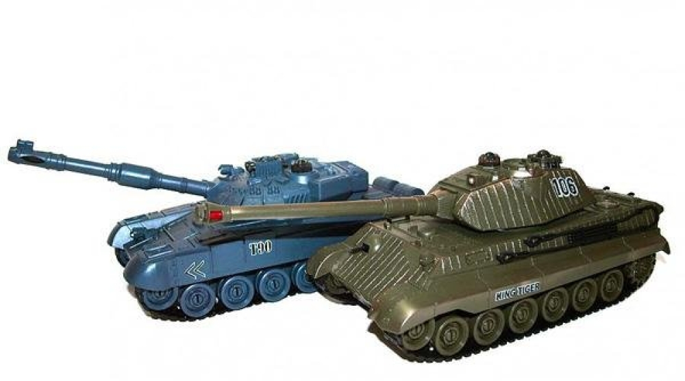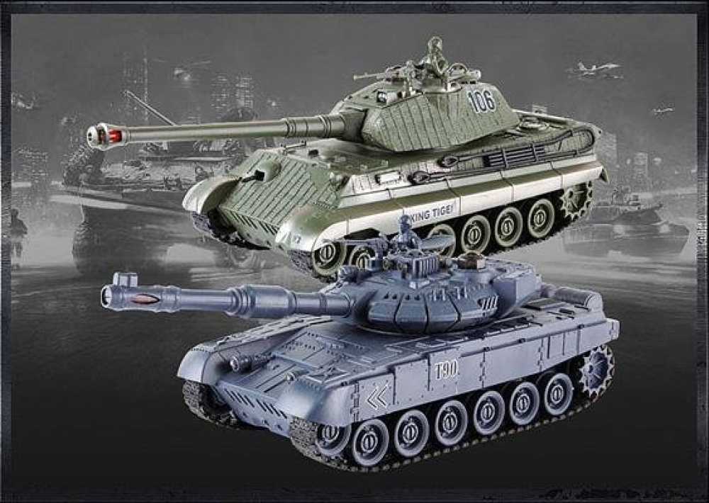 Танковые бои на радиоуправлении, полностью собранные и готовые для игры. Советский Тype 90 и немецкий Тигр. Оба танка оснащены инфракрасными пушками, у каждого из них есть 4 светодиодных индикатора попадания. Башня вращается на 330 градусов.