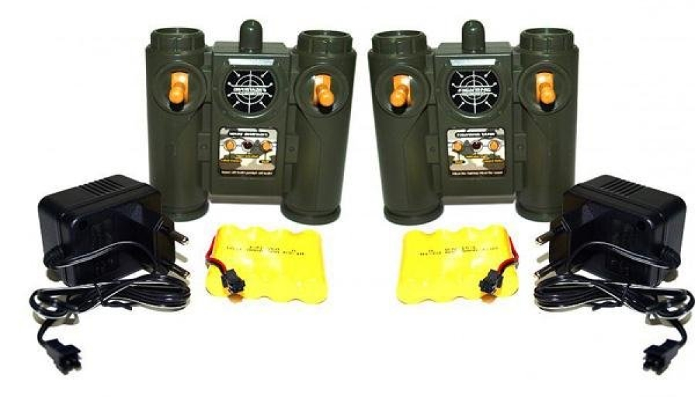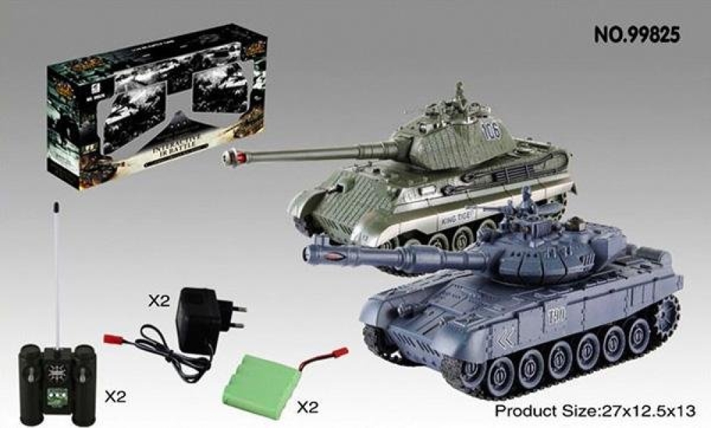 В комплекте: 2 танка (Russian Type 90 v2 и German Tiger v2), 2 аккумулятора Ni-Cd 4.8v 400mAh, 2 зарядных устройства 4,8 В, 2 пульта, инструкция.