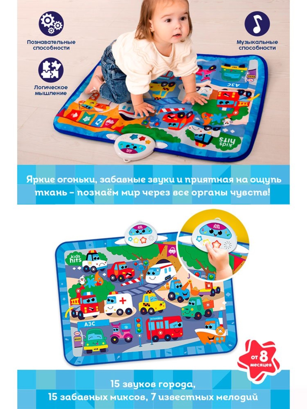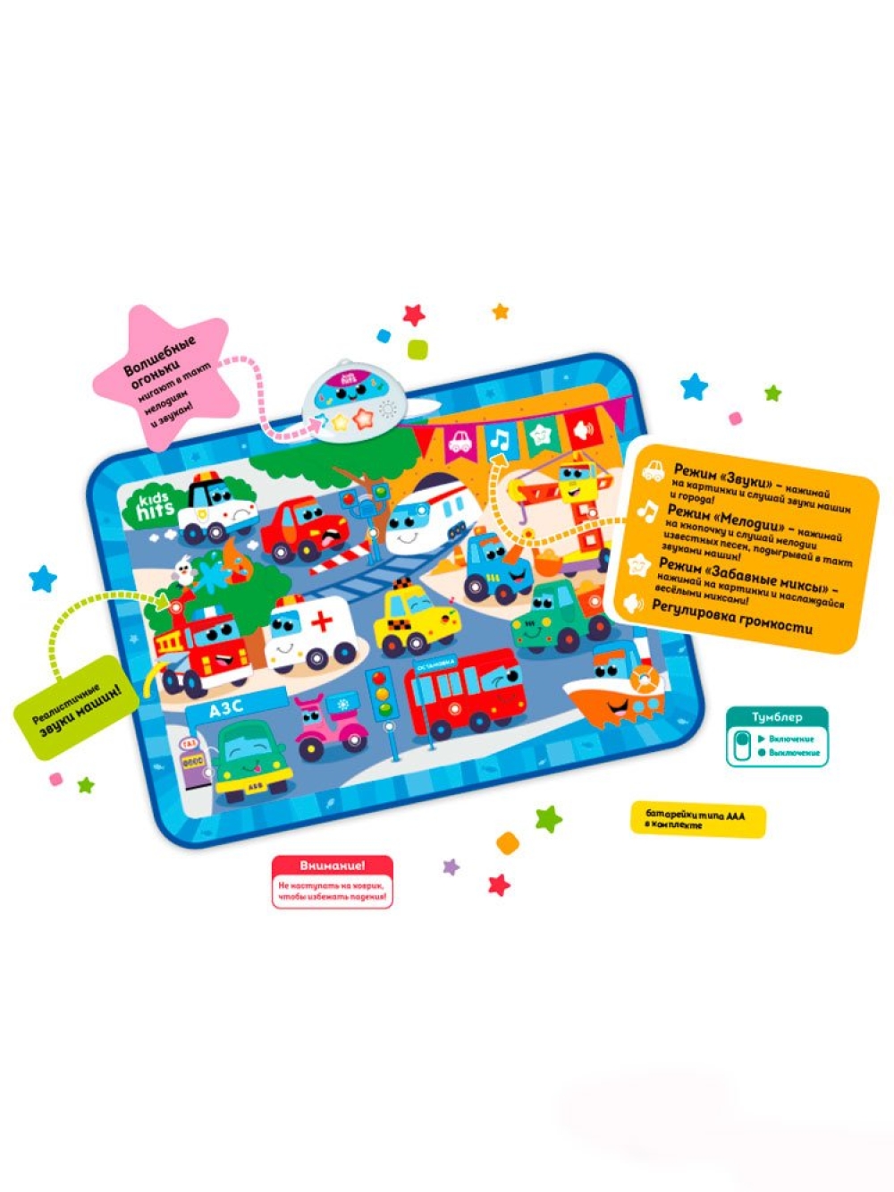 Коврик предлагает различные интересные режимы: Звук, Мелодии и Забавные миксы, которые будут развлекать и радовать юных исследователей. Слушая 15 звуков города, 15 забавных миксов и 7 известных мелодий, дети развивают познавательные способности и музыкальный слух. Каждое нажатие на коврик становится шагом к новым знаниям и открытиям.