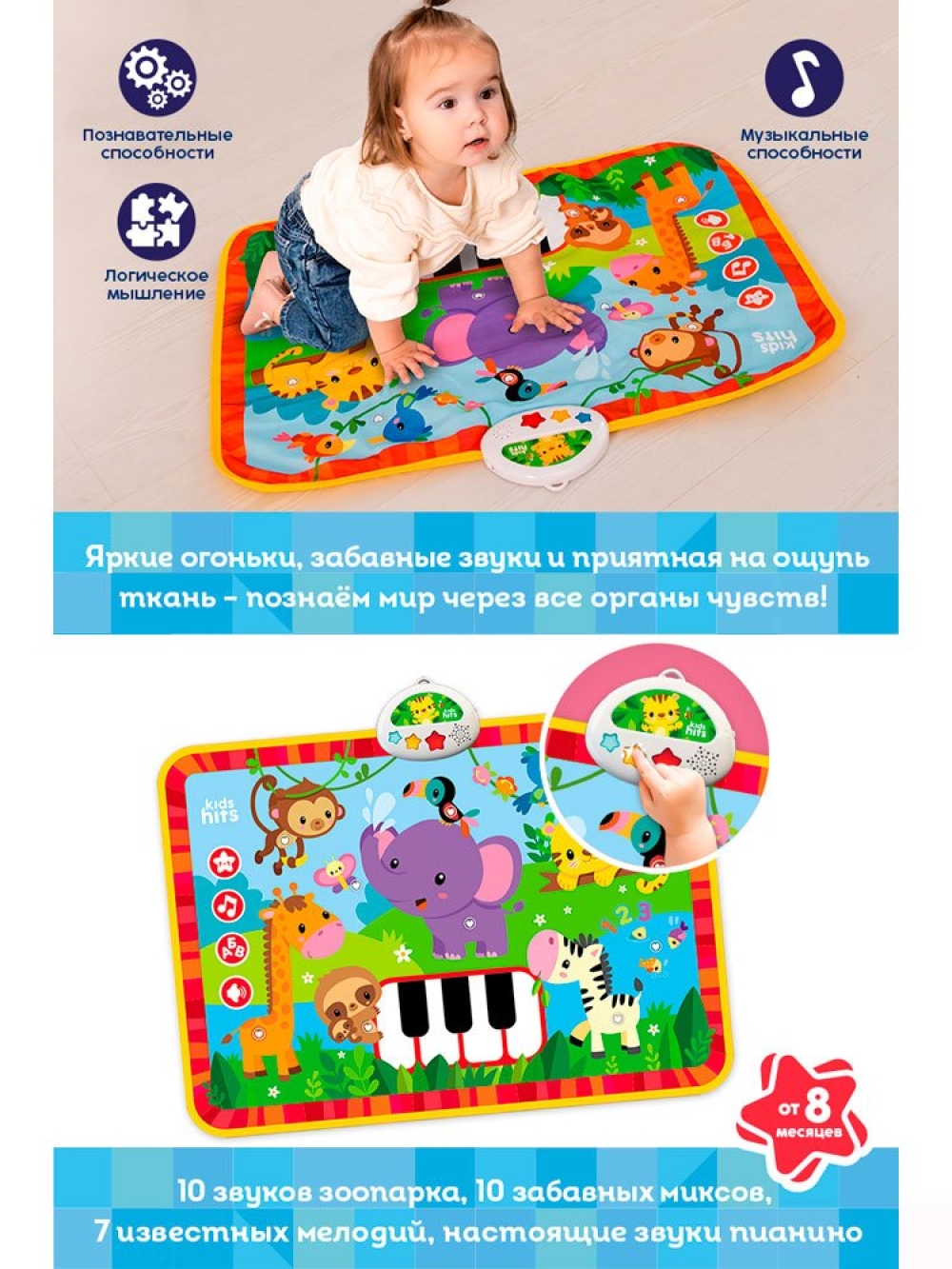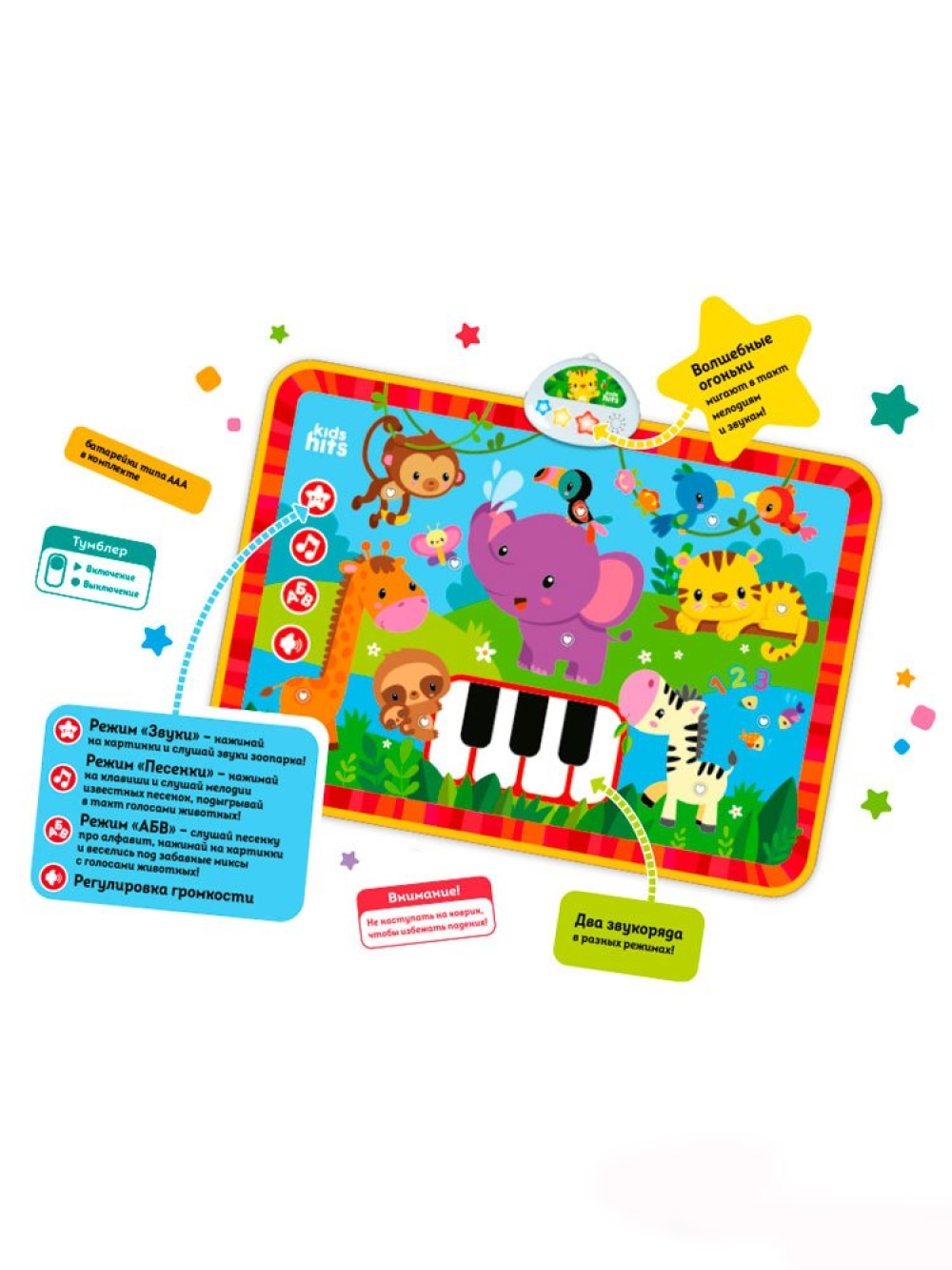 Коврик предлагает различные интересные режимы: Звук, Мелодии и Забавные миксы, которые будут развлекать и радовать юных исследователей. Слушая 10 звуков зоопарка, 10 забавных миксов и 7 известных мелодий, дети развивают познавательные способности и музыкальный слух. Каждое нажатие на коврик становится шагом к новым знаниям и открытиям.